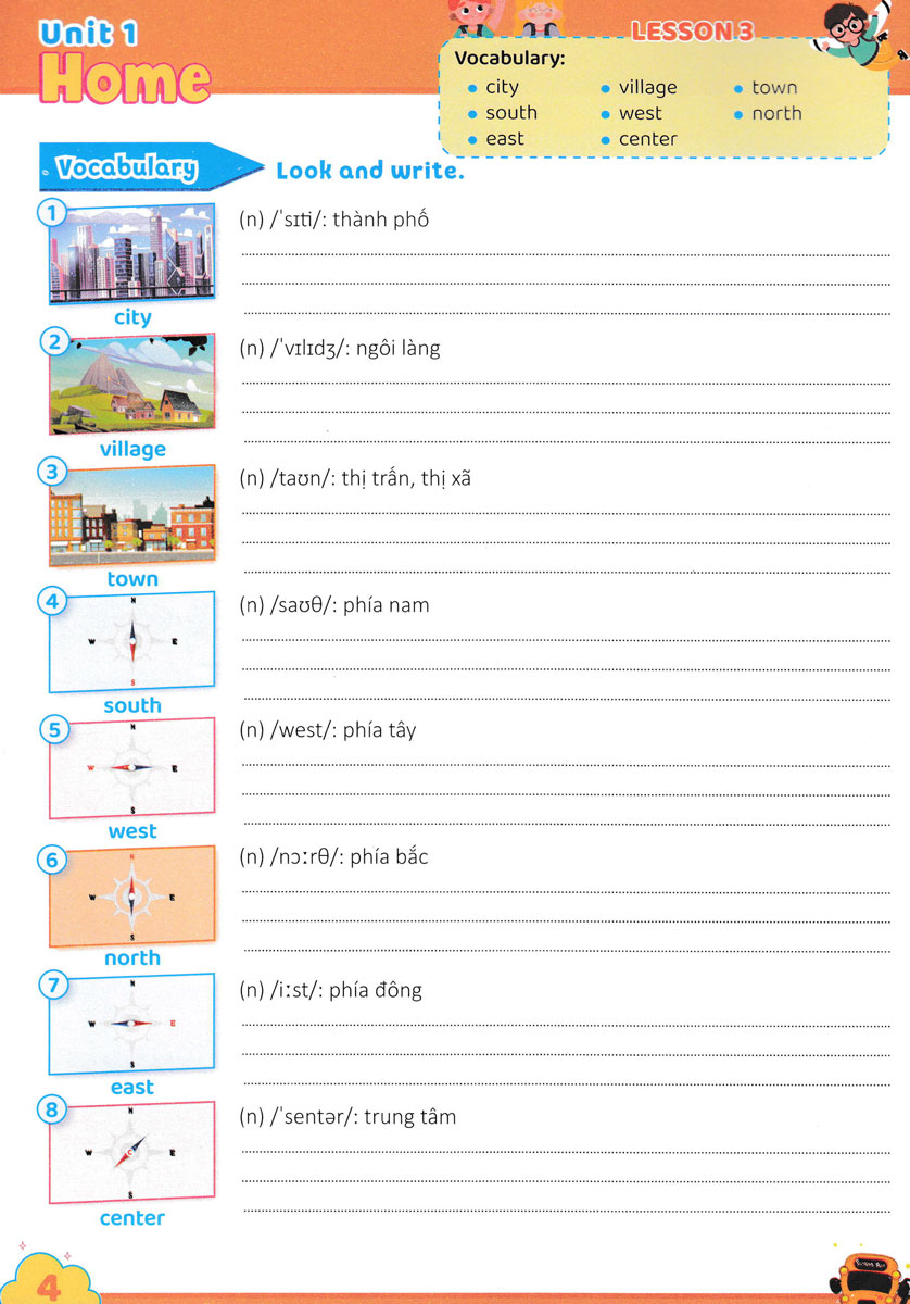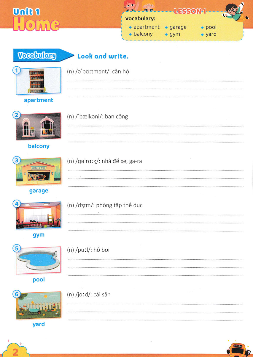 Từ đó, các em có thể sử dụng từ để xây dựng câu trong hoạt động giao tiếp, cũng như giải quyết các bài tập về từ vựng, ngữ pháp… Các em sẽ luyện viết và học từ tiếng Anh bằng các hình ảnh minh họa sinh động. Sau phần luyện từ vựng là các hoạt động chọn từ đúng, điền từ, ghép từ với hình thích hợp, sắp xếp từ, Sau mỗi đơn vị bài học có phần ôn tập (Review) với các hoạt động lý thú giúp các em củng cố kiến thức. Thông qua các hoạt động này các em sẽ cảm thấy hứng thú và tích cực hơn trong quá trình học tập môn Tiếng Anh.