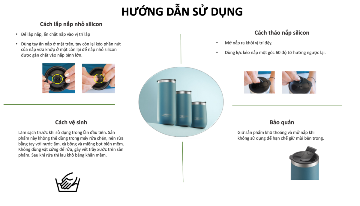 Ly giữ nhiệt Xploris Ưu điểm và tiện ích: Ly giữ nhiệt thời trang, thân thiện với môi trường cùng hai màu xanh đặc trưng: xanh lá đậm và xanh da trời. - Logo được khắc trên bề mặt sản phẩm phong cách năng động, trẻ trung cá tính - Sản phẩm phù hợp với các bạn trẻ yêu thích thiên nhiên, môi trường, thời trang, sành điệu. - Khả năng giữ nóng, lạnh tốt với hai lớp giữ nhiệt thép không gỉ, có thể giữ nóng đến 4H và lạnh đến 16H* - Thân ly sơn tĩnh