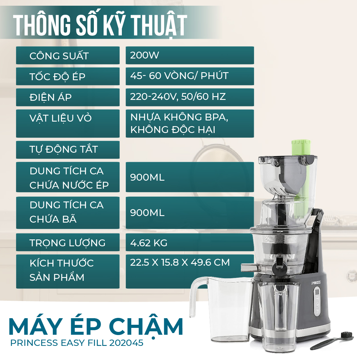 Sử dụng máy ép chậm Princess Easy Fill 202045, bạn có thể ép kiệt 99% lượng nước trong thực phẩm, lưu giữ 99% vitamin và khoáng chất, vượt trội hoàn toàn so với các loại máy ép khác trên thị trường