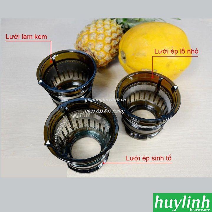 2 bộ lưới lọc mịn (lưới ép trái cây) và thô (lưới xay sinh tố) cho phép bạn tạo ra ly nước ép phù hợp với lượng xơ mà bạn muốn có trong ly nước ép của mình. Thông thường bạn chọn lưới lọc mịn (lưới có lỗ nhỏ) cho việc ép các loại trái cây cứng hoặc rau củ như: ổi, cà rốt, cóc…Lưới thô (lưới có lỗ to) sẽ phù hợp khi ép các loại trái cây, hoa quả mềm như: dưa hấu, đu đủ hoặc xoài…