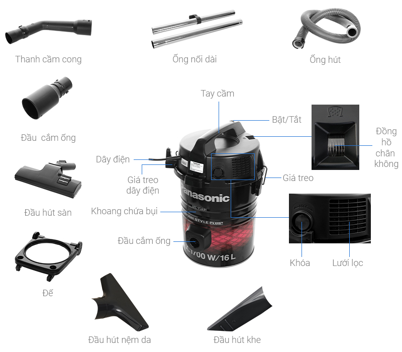 THÔNG SỐ KỸ THUẬT Khoang chứa bụi: Hộp chứa - 16 lít Công suất hoạt động: 1700W Tiện ích: Chiều dài dây điện: 8m Đầu hút bụi: Đầu hút khe Đầu hút sàn Đầu hút