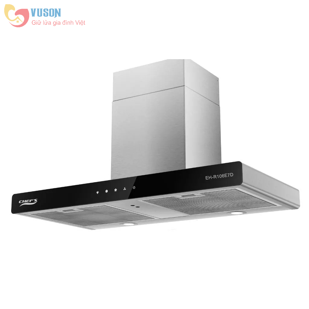 Thông tin sản phẩm  Máy hút mùi Chefs EH-R106E7D hình dáng chữ T phù hợp với nhiều không gian bếp hiện đại. Chất liệu thân máy làm từ inox cao cấp 430 sang trọng, màu sắc sáng,