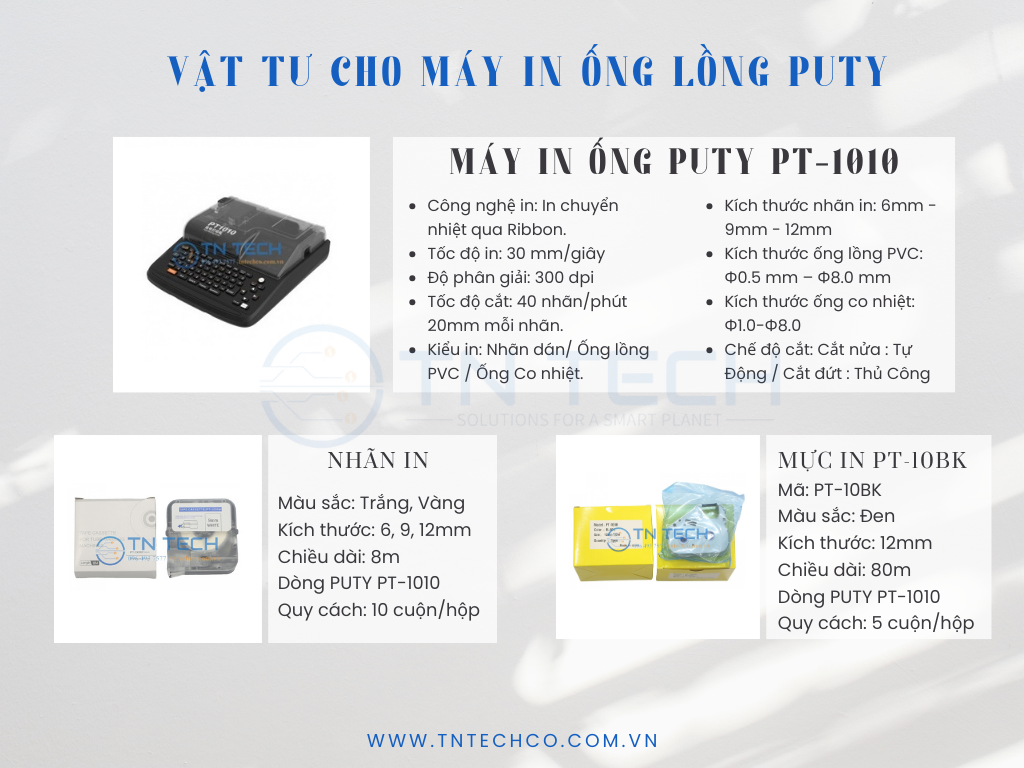 MÁY IN ỐNG PUTY PT-1010 Tên sản phẩm Máy in ống Puty PT-1010 Công nghệ in In chuyển nhiệt qua Ribbon Tốc Độ in 30 mm/giây (Max) Độ Phân Giải in 300dpi Tốc Độ cắt
