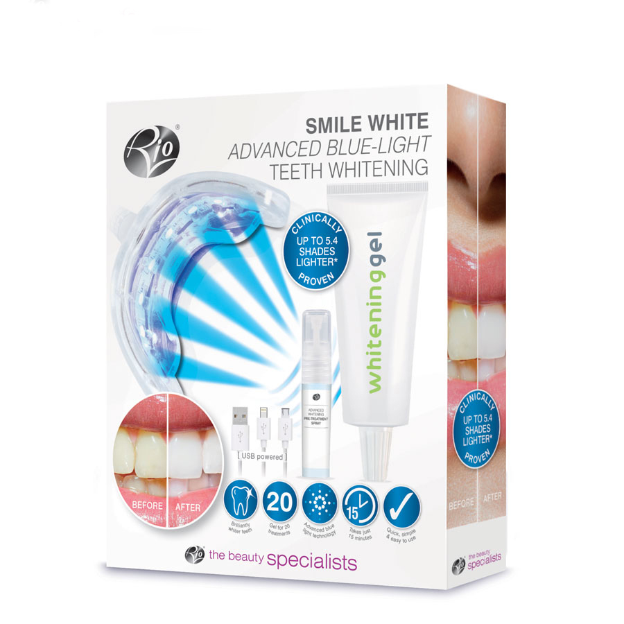 - Hàm răng trắng sáng chỉ với 15 phút mỗi ngày để loại bỏ vết ố vàng do cà phê, trà, thuốc lá, rượu vang gây ra Bộ sản phẩm máy làm trắng răng RIO DCWU đầy đủ gồm: