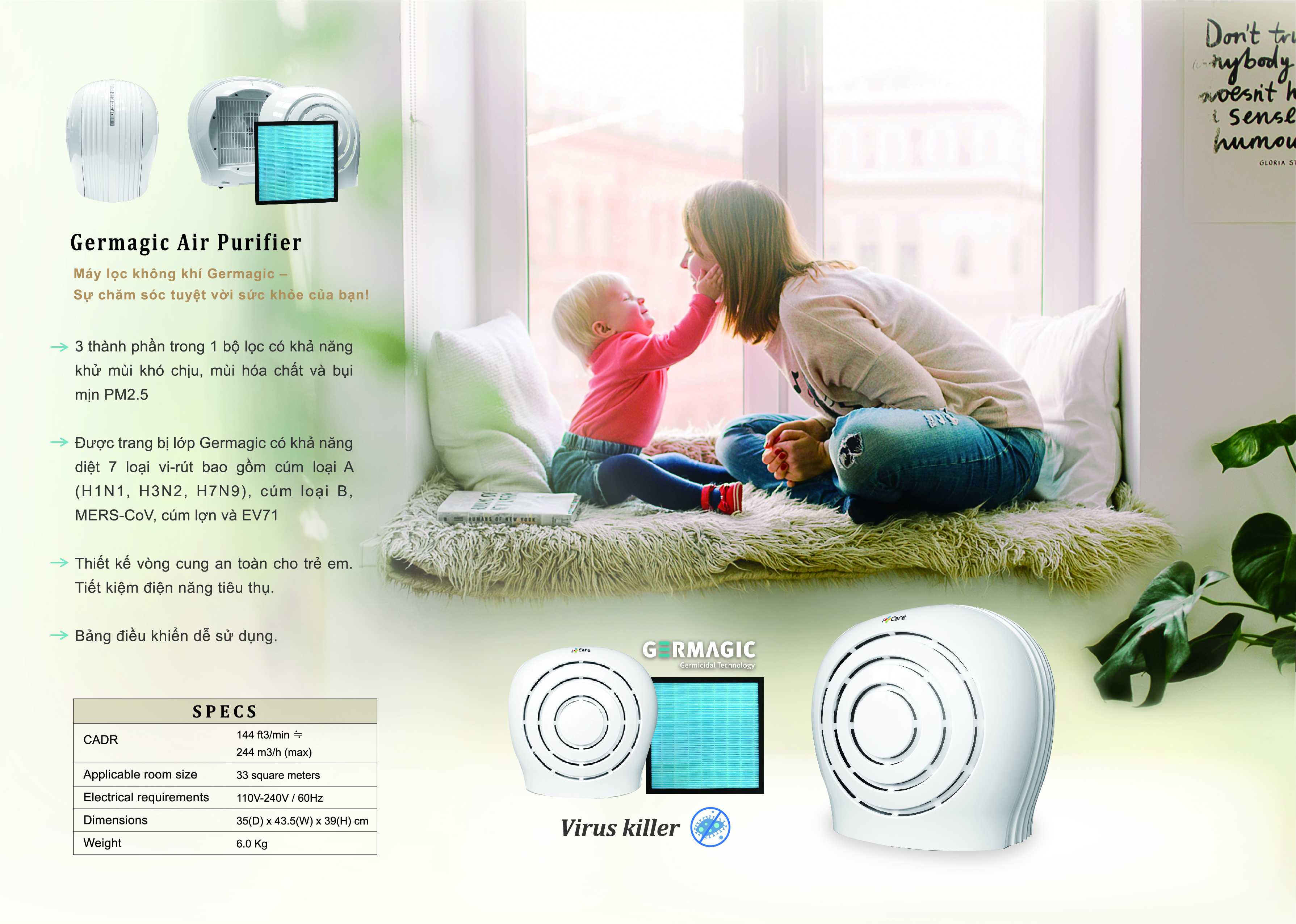 _Nhanh chóng lọc sạch không khí ô nhiễm _khử bay mùi ẩm mốc khó chịu từ máy điều hòa, mùi thức ăn, nấu nướng _Thiết kế cực kì thân thiện và an toàn cho trẻ em và vật nuôi. Bạn vẫn còn đắn đo vì sao cần phải có máy lọc không khí đúng không? Chính vì các nguyên nhân này đây: Trung bình 90% thời gian là chúng ta sinh hoạt trong các không gian kín. Khi bầu khí quyển ở các thành phố lớn như Hà Nội và TP. HCM đang ở mức báo động, chúng ta thường tin rằng ở nhà sẽ lành hơn nhiều để tránh khói xe và bụi bặm. Song trong nhà liệu có thực sự trong lành và an toàn như chúng ta vẫn nghĩ? Ngay trong chính tổ ấm của chúng ta, hàng ngày hàng giờ đang tồn tại những vị khách “không mời mà tới”: bụi bẩn, khói đun nấu, chất tẩy rửa, lông vật nuôi… Theo Hiệp hội Bảo vệ Môi trường Hoa Kỳ, các chất ô nhiễm tiềm ẩn này khi ở trong không gian kín sẽ có điều kiện sản sinh thuận lợi hơn so với không gian mở; từ đó có thể gây nhức đầu thường xuyên, tăng nguy cơ dị ứng, hen suyễn và suy hô hấp. Đặc biệt, trẻ nhỏ và người lớn tuổi là những người có nguy cơ dị ứng, nhiễm bệnh cao do ô nhiễm không khí, vì vậy rất cần được bảo vệ kỹ càng. Máy lọc không khí – khoản đầu tư thông minh cho sức khoẻ gia đình Đặt sức khoẻ lên trên hết, nhiều gia đình đã tìm mọi cách làm sạch không khí như thường xuyên quét nhà, lau dọn, hút bụi, thậm chí nhờ đến các dịch vụ vệ sinh chuyên nghiệp. Song những phương pháp nói trên chỉ có thể loại bỏ những ô nhiễm mà mắt thường có thể thấy được, mà để “lọt lưới” không ít khói bụi, mùi hương và những chất ô nhiễm kích thước siêu nhỏ cũng độc hại không kém. Lúc này, một chiếc máy lọc không khí tốt sẽ là giải pháp cho những ai đang lo lắng tìm lời giải cho bài toán thanh lọc không khí trong nhà. Không khí trong lành – Món quà vô giá cho tổ ấm yêu thương So sánh với các chi phí tốn kém để chữa trị các chứng bệnh gây ra do ô nhiễm không khí, cùng những tổn hại sức khỏe khó phục hồi, thì một chiếc máy lọc không khí chắc chắn là khoản đầu tư vô cùng thông minh, hợp lý. Với bầu không khí trong lành, thoải mái và an tâm, căn nhà sẽ thực sự là tổ ấm yêu thương, là chốn đi về sau những giờ làm việc bận rộn, giúp gắn kết gia đình và tái tạo năng lượng cho những ngày sắp tới. Chỉ cần cắm điện và bật máy, bạn sẽ luôn được hít thở trong không gian trong lành khi trở về nhà.