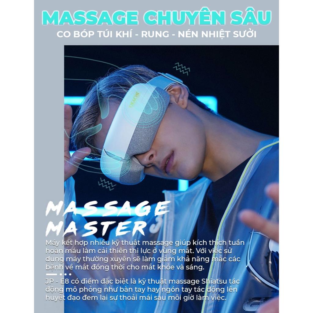 Với 06 túi khí massage và chức năng rung đa tần, JP-E8 tăng cường lưu thông máu dưới vùng da mắt, giúp tạo cảm giác thư thái và dễ chịu. Chế độ chườm nóng linh hoạt giúp phục hồi mắt và giảm nhức mỏi.