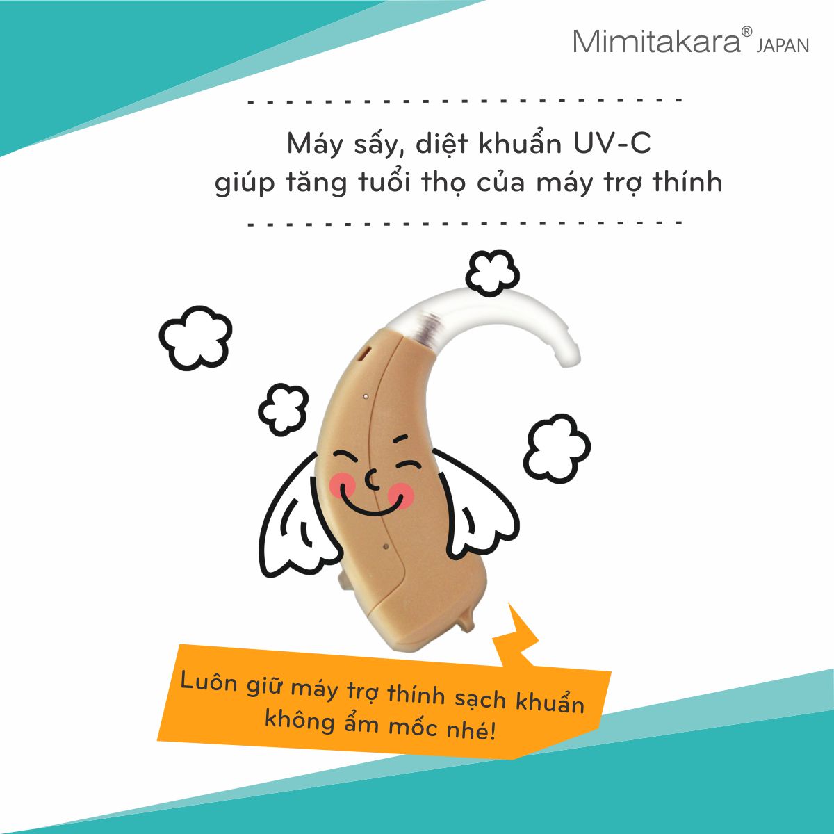 - Máy có khay để pin của máy trợ thính, đặt pin vào khay và kiểm tra dung lượng còn lại của pin dễ dàng. CÁCH SỬ DỤNG MÁY SẤY DIỆT KHUẨN MIMITAKARA UP-221 Thiết kế hiện đại, cầm tay: Kích thước nhỏ gọn, dễ dàng đặt ở nhiều vị trí trong gia đình. Cách sử dụng: .
