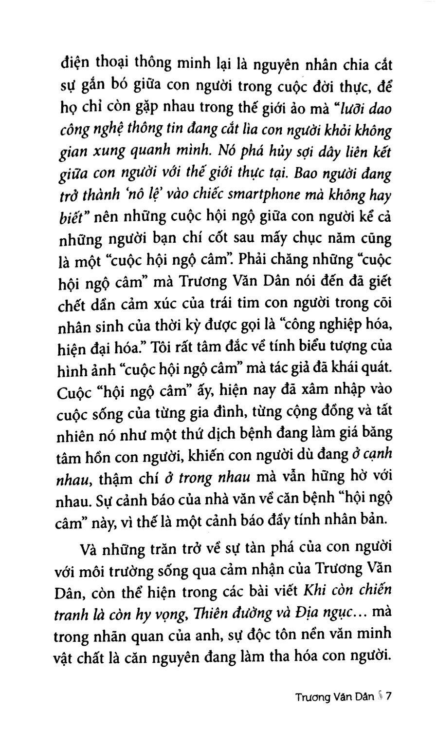 Có thể nói những cuộc viễn du của Trương Văn Dân khắp năm châu, bốn biển cũng là một phương thức để tích lũy vốn sống cho những trang viết. Chính vì vậy ở những câu chuyện của Trương Văn Dân, cuộc sống bày ra ngồn ngộn, thậm chí khá bộn bề.(…) Một phương diện khác của cõi nhân sinh trong Milano Sài Gòn, đang về hay sang? đó là nỗi ám ảnh về nguồn cội, về đất nước quê hương mà dẫu có sống ở những quốc gia giàu sang đến mức nào thì khát vọng tìm về cội nguồn vẫn luôn canh cánh trong lòng những con dân nước Việt. Và đây là những trang văn hay và cảm động trong tập truyện mà Trương Văn Dân muốn chia sẻ với người đọc với tư cách là một chứng nhân, là người trong cuộc. …, Hy vọng, đọc tác phẩm này các bạn sẽ chia sẻ với những vấn đề tác giả nói đến trong cõi nhân sinh và tìm được cho mình “một cõi đi về”. Đó là cõi đi về phía ánh sáng của tình yêu thương, lòng nhân ái và sự hướng thiện, vốn là những giá trị hằng cửu mà những tác phẩm văn học đích thực mang đến cho con người. Milano Sài Gòn, đang về hay sang? của Trương Văn Dân là một tác phẩm văn chương như thế mà tôi muốn chia sẻ như một người đọc tri âm .