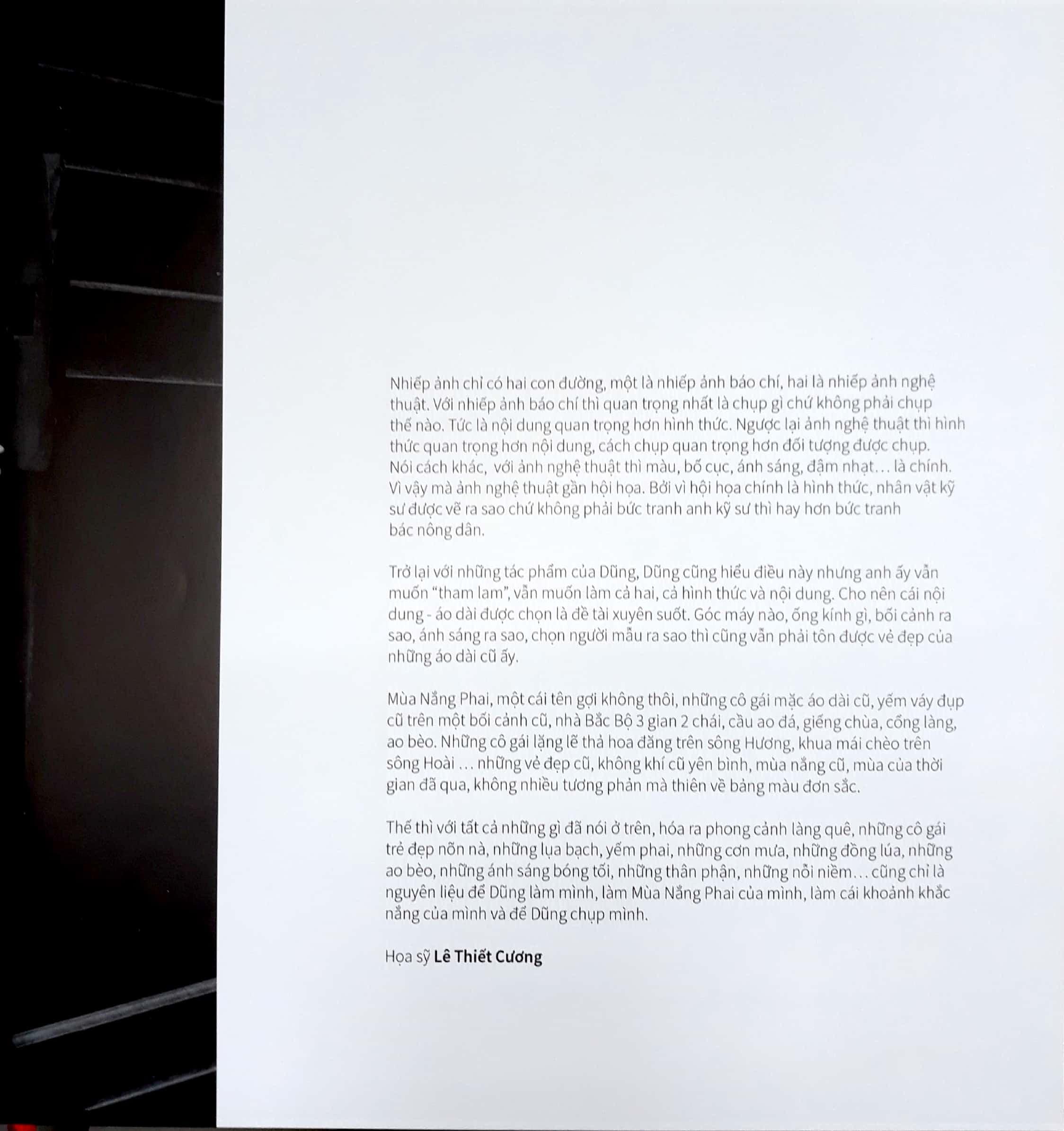 Trong những tác phẩm của mình, tác giả cũng hiểu điều này nhưng anh ấy vẫn muốn “tham lam”, vẫn muốn làm cả hai, cả hình thức và nội dung. Cho nên cái nội dung – áo dài được chọn là đề tài xuyên suốt. Mùa Nắng Phai, một cái tên gợi không thôi, những cô gái mặc áo dài cũ, yếm váy đụp cũ trên một bối cảnh cũ, nhà Bắc Bộ 3 gian 2 chái, cầu ao đá, giếng chùa, cổng làng, ao bèo; những vẻ đẹp cũ, không khí cũ yên bình, mùa nắng cũ hay mùa của thời gian đã qua… Hóa ra phong cảnh làng quê, những cô gái trẻ đẹp nõn nà, những lụa bạch, yếm phai, những cơn mưa, những đồng lúa, những ao bèo, những ánh sáng bóng tối, những thân phận, những nỗi niềm… cũng chỉ là nguyên liệu để tác giả làm mình, làm Mùa Nắng Phai của riêng mình.