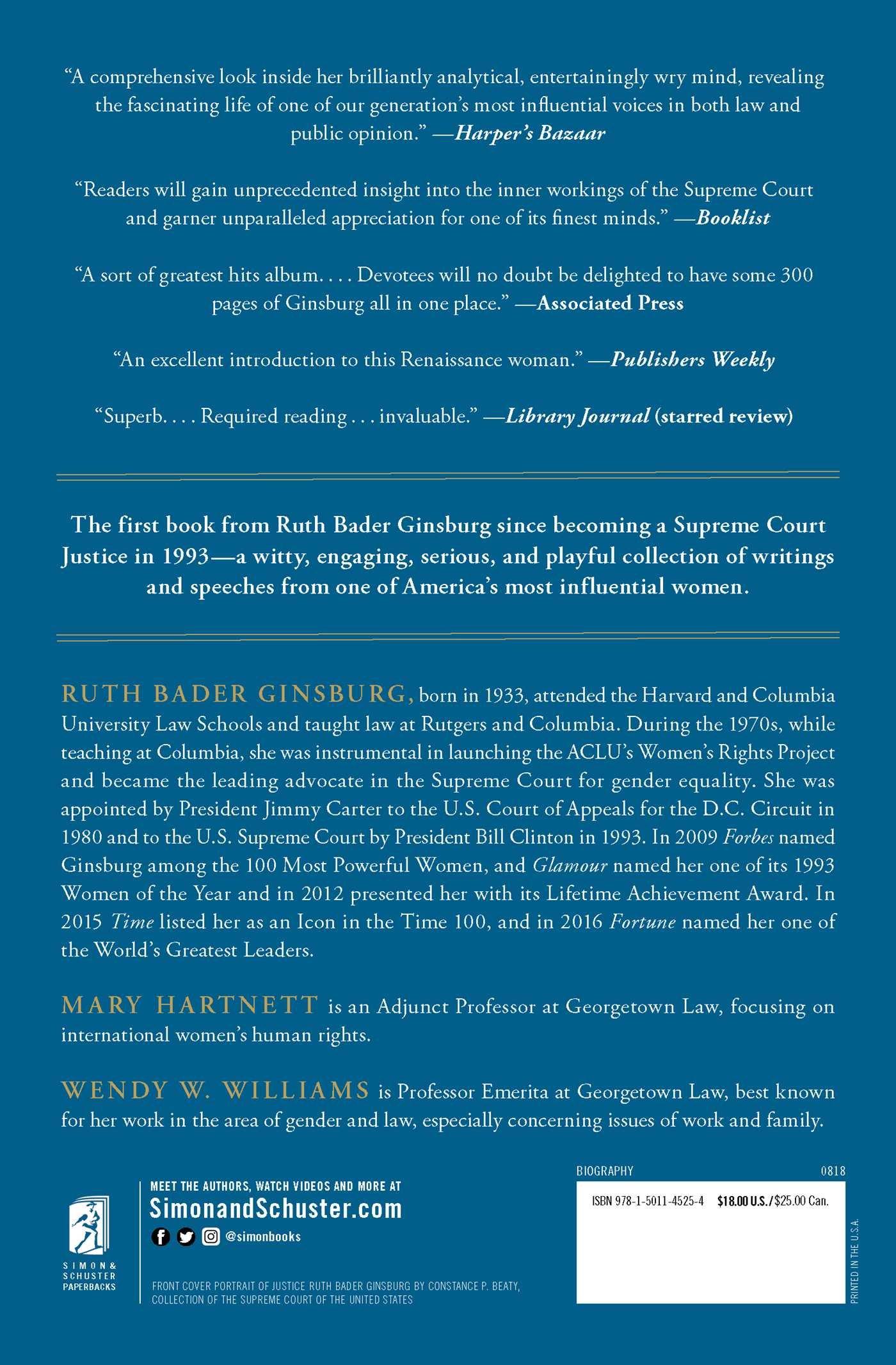 My Own Words The New York Times bestselling book from Supreme Court Justice Ruth Bader Ginsburg-"a comprehensive look inside her brilliantly analytical, entertainingly wry mind, revealing the fascinating life of one of our generation's most influential voices in both law and public opinion" (Harper's Bazaar). My Own Words "showcases Ruth Ginsburg's astonishing intellectual range" (The New Republic). In this collection Justice Ginsburg discusses gender equality, the workings of the Supreme Court, being Jewish, law and lawyers in opera, and the value of looking beyond US shores when interpreting the US Constitution. Throughout her life Justice Ginsburg has been (and continues to be) a prolific writer and public speaker. This book's sampling is selected by Justice Ginsburg and her authorized biographers Mary Hartnett and Wendy W. Williams, who introduce each chapter and provide biographical context and quotes gleaned from hundreds of interviews they have conducted. Witty, engaging, serious, and playful, My Own Words is a fascinating glimpse into the life of one of America's most influential women and "a tonic to the current national discourse" (The Washington Post) .