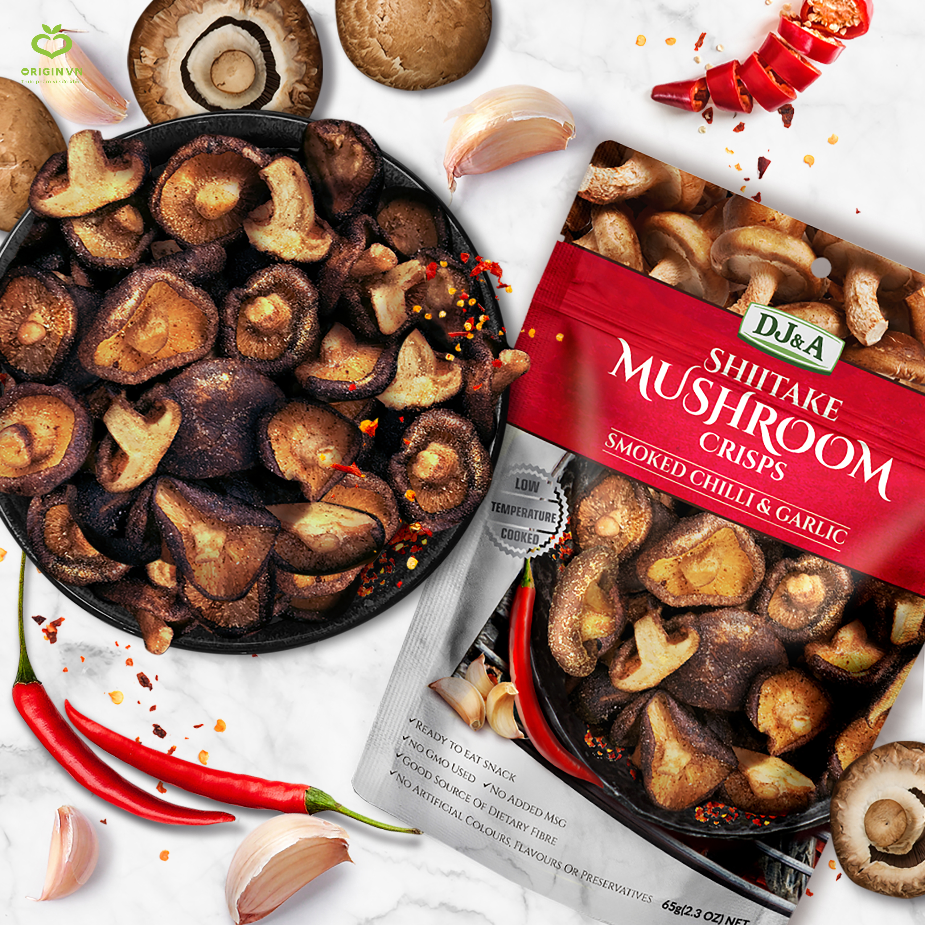 Nấm hương sấy giòn DJ&A Úc - 65g THÔNG TIN SẢN PHẨM - Sản phẩm sử dụng ăn liền, tuyệt ngon, giòn rụm, đậm đà mùi vị nấm. - Không chứa Gluten, đường, rất ít