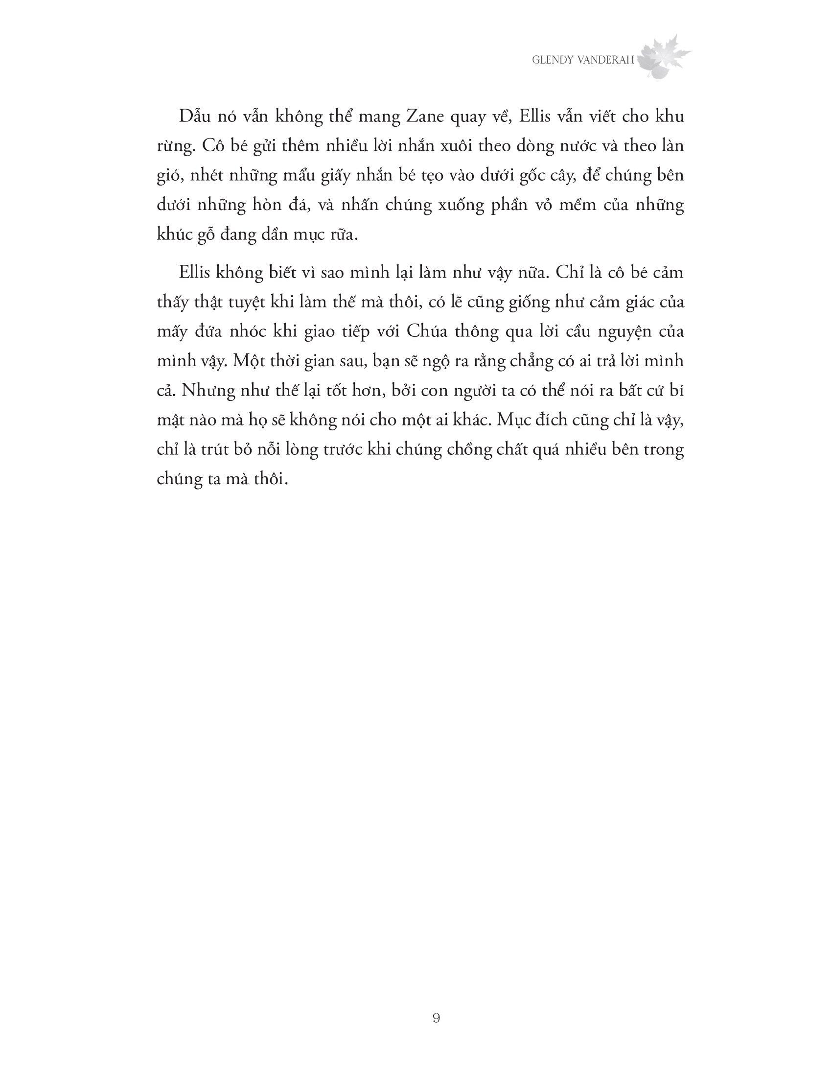 Sau Nơi khu rừng chạm tới những vì sao, Glendy Vanderah (tác giả sách bán chạy theo bình chọn của Wall Street Journal) đã tiếp nối những cảm xúc thứ tha và chữa lành ấy bằng một cuốn tiểu thuyết tuyệt diệu về tình yêu, sự mất mát và hành trình khám phá bản thân, The light through the leaves.