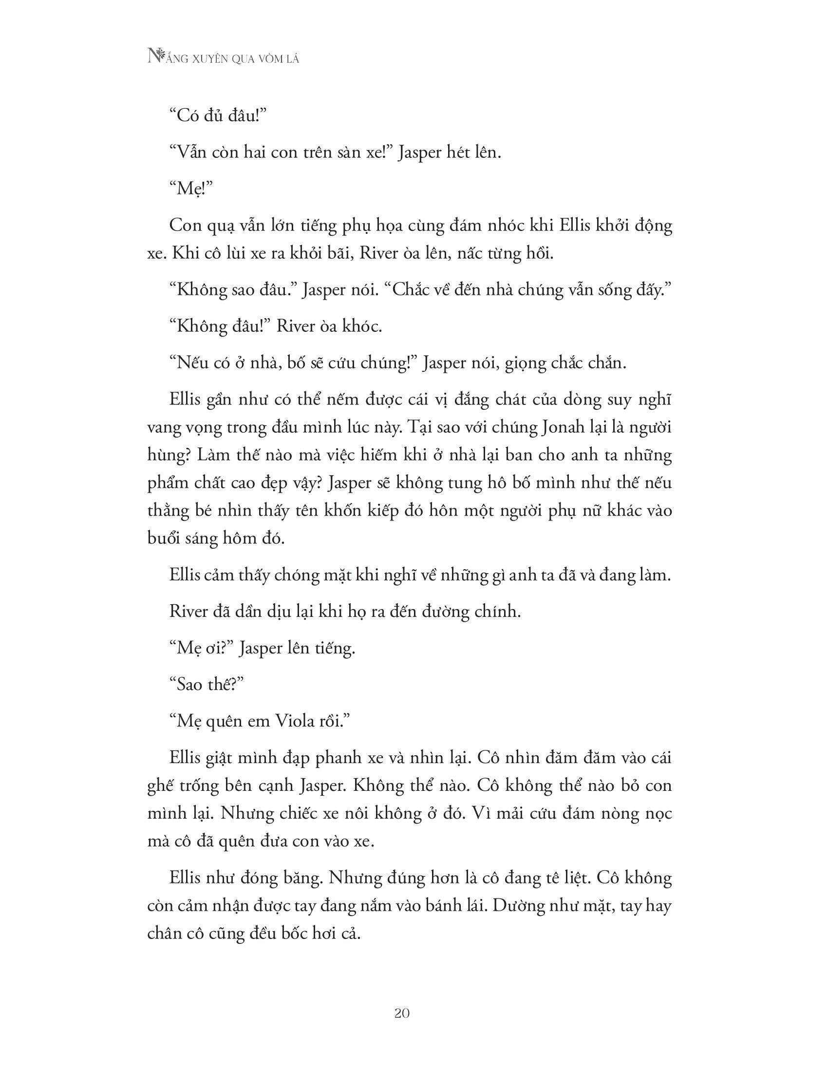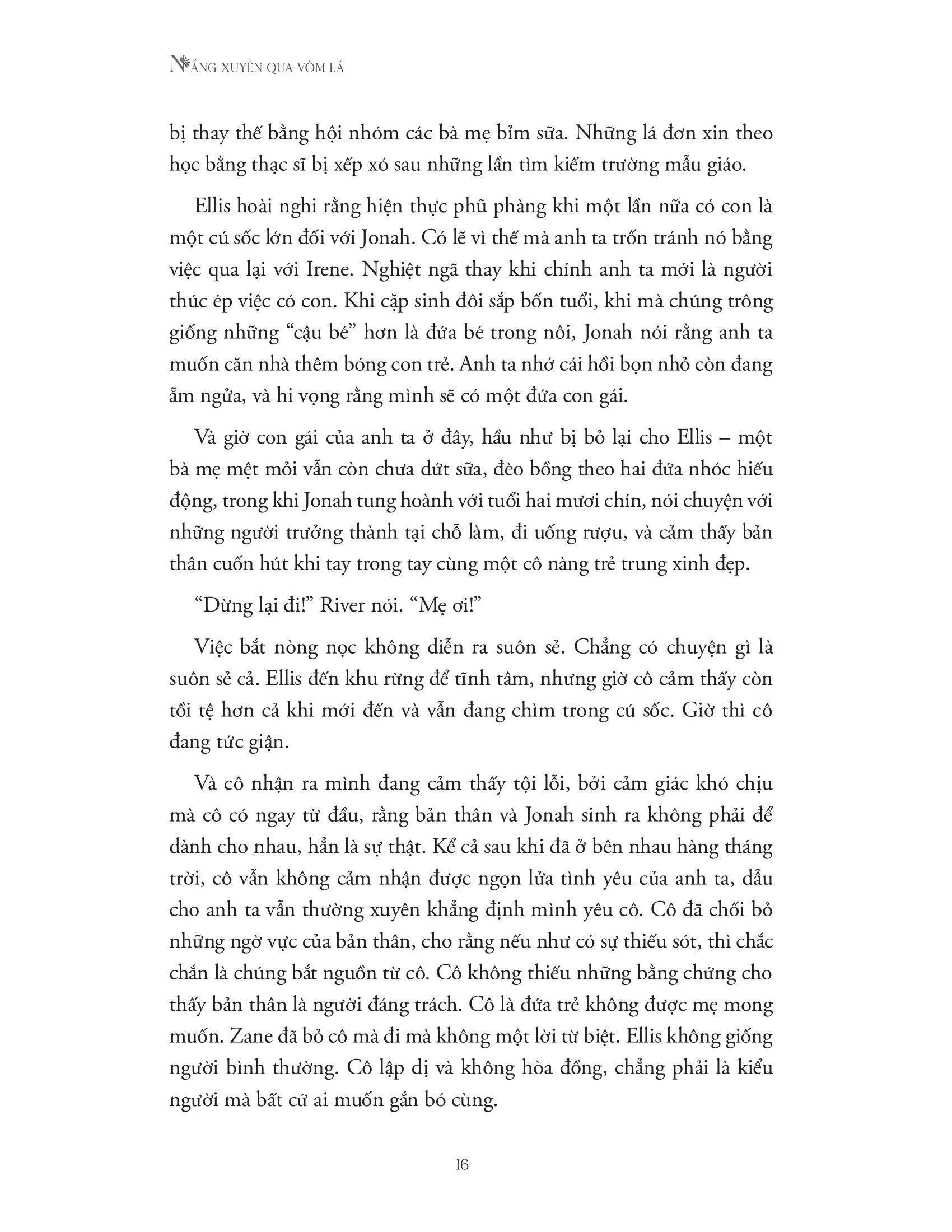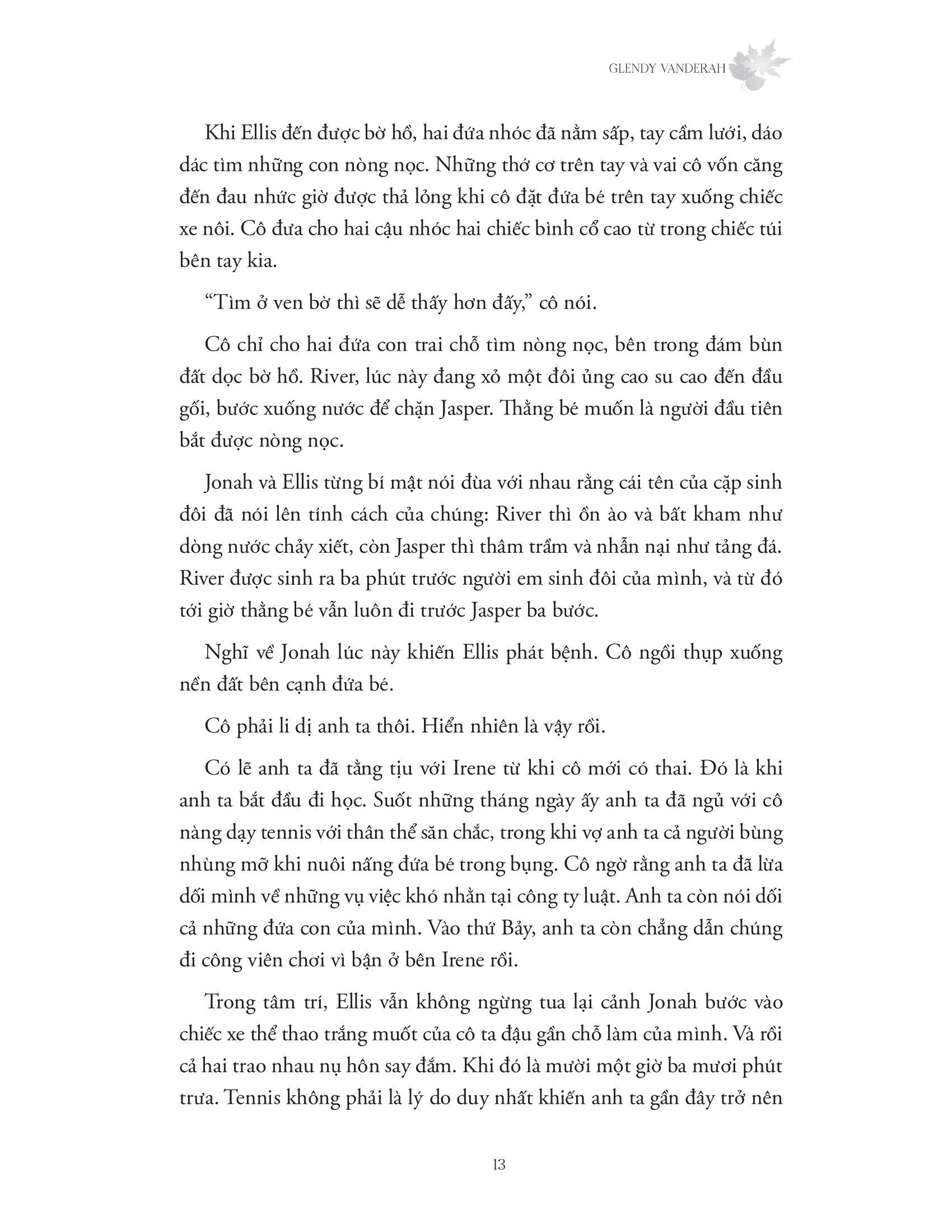 Trong cơn bấn loạn ấy, Ellis Abbey đã vô tình rời mắt khỏi cô con gái của m.ình, Viola – dù chỉ trong vài phút. Nhưng khi cô quay lại, Viola đã biến mất. Vết nứt sẵn trong cuộc hôn nhân của họ đã toác rộng hơn, cùng với đó vụ bắt cóc cũng khiến Ellis biến mất – mà thực ra là cô đã vùi m.ình trong đau buồn, tội lỗi và nghiện ngập. Với suy nghĩ rằng m.ình chỉ mang lại sự đen đủi cho gia đình, Ellis đã bỏ lại chồng cùng hai cậu con trai nhỏ, vùi sâu hơn nỗi đau đớn đến tuyệt vọng về các con trong hành trình độc bước vào một vùng núi hoang vu.