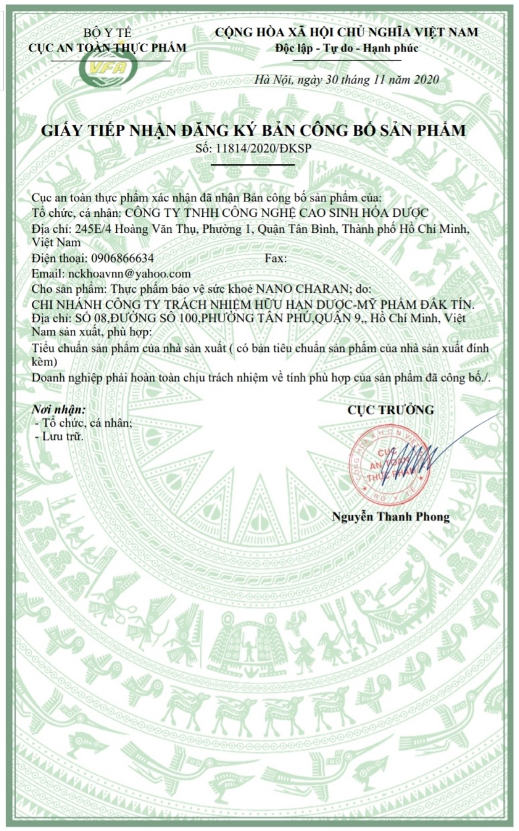 - Nano Charan được kiểm định chứng nhận chất lượng sản phẩm và cấp phép lưu hành