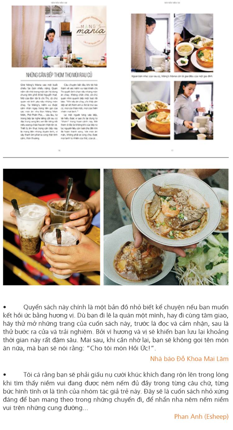 Trong quyển sách này, bạn có thể sống trong không khí ấm áp của mâm cơm gia đình, tận hưởng niềm hân hoan bên một chén nước mắm nhỏ, hay cảm thấy may mắn khi thưởng thức những món ăn có tuổi đời gần trăm năm. Là cảm giác tự tin cho những cô gái với nỗi sợ cầm dao khi vào bếp, hay đơn giản là rụng rời trước vị ngon của những món ăn đường phố Tất cả tụ họp nơi đây để làm nên thứ gia vị giúp bất kỳ ai khi "nếm" đầu cảm thấy cuộc sống đậm đà hơn.