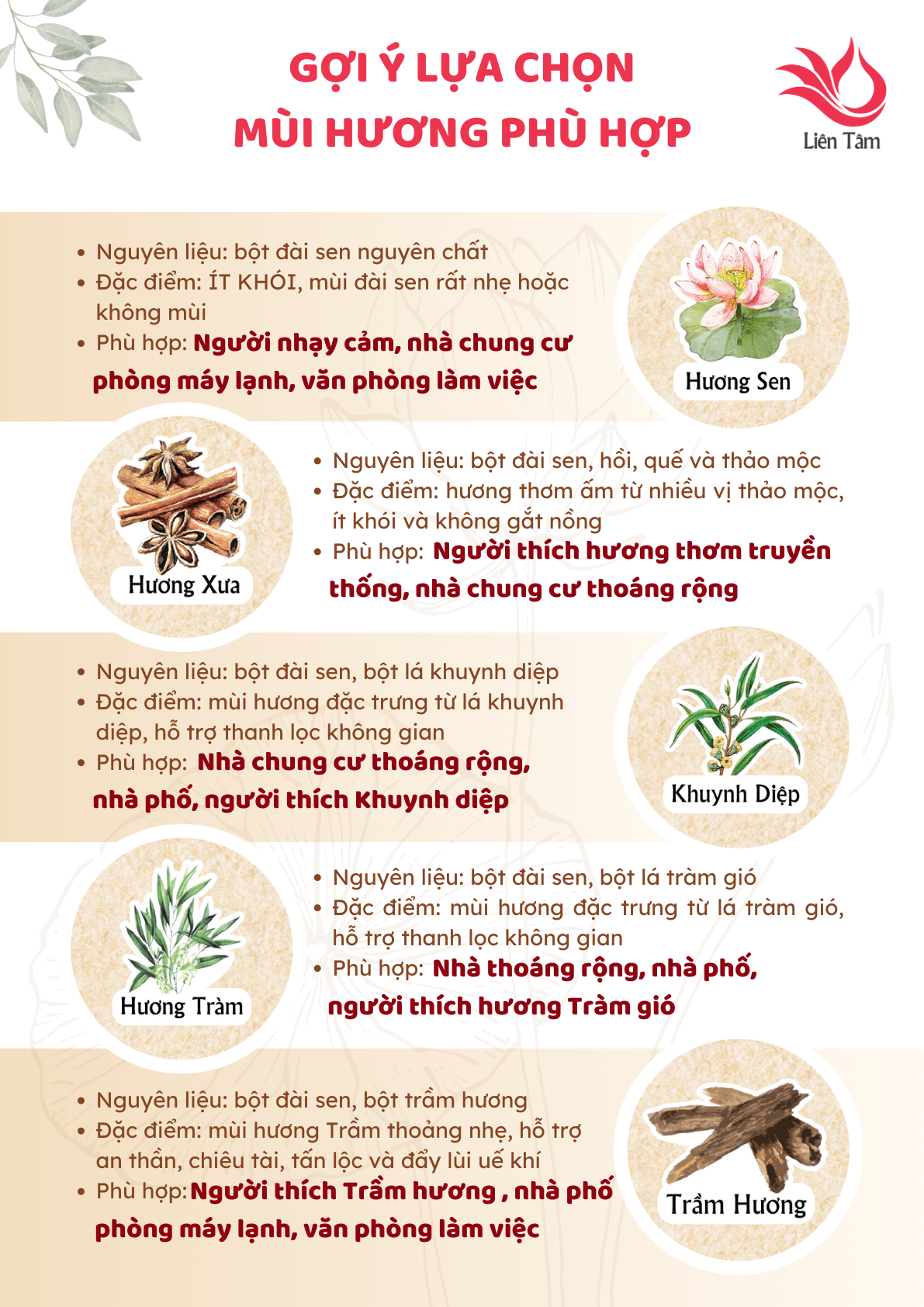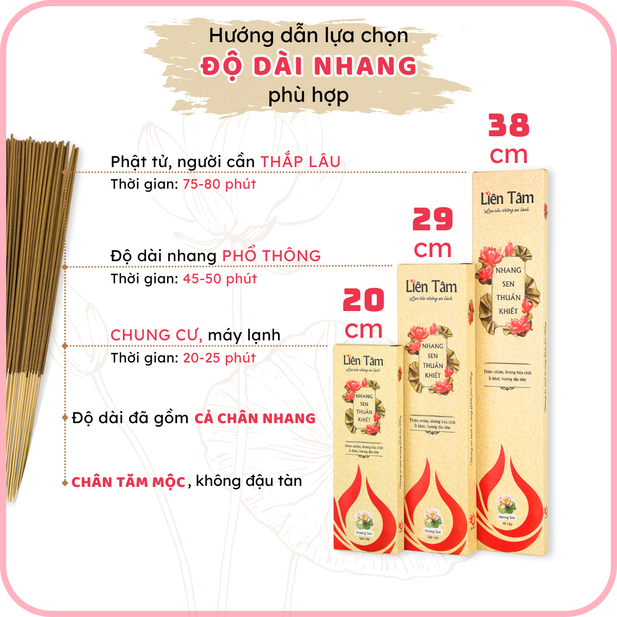 - LƯU Ý: Mùi nhang sen dịu nhẹ, ít khói phù hợp với những gia đình có không gian kín, chung cư, trần thấp, gia đình có trẻ nhỏ, có người nhạy cảm với khói nhang hoặc mùi hương, thắp nhang nơi sinh hoạt chung. TẠI SAO LÀ NHANG SEN LIÊN TÂM?