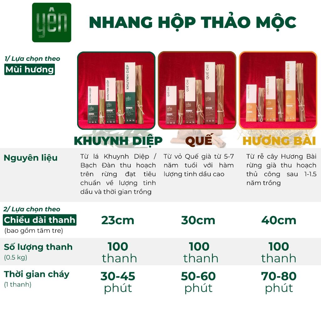 Thông tin sản phẩm Nhang Sạch Thảo Mộc Tự Nhiên YÊN Mix Quế Chi, Khuynh Diệp và Hương Bài Xuất xứ nhang trầm hương: làng nghề Tùng Lộc, huyện Can Lộc, tỉnh Hà Tĩnh. Nhang quế chi: 98% làm từ vỏ quế già (5-7 năm), 2% bột bời lời Nhang khuynh diệp: 98% làm từ lá khuynh diệp già nhiều tinh dầu (tại rừng Tùng Lộc), 2% bột bời lời Nhang hương bài: 98% làm từ rễ cây bài (tại Quỳnh Lưu), bột mía (tạo vị ngọt), cam thảo, hồi, quế, 2% bột bời lời Số lượng nhang: 100 thanh / hộp Phân loại theo chiều dài thanh nhang (tính từ gốc đến ngọn - bao gồm tăm tre) và tùy chọn theo mùi Hộp 23cm - dành cho trần thấp, chung cư: thời gian cháy 30-45 phút / thanh Hộp 30cm: thời gian cháy 50-60 phút / thanh Hộp 40cm: thời gian cháy 70-80 phút / thanh Combo 2 mùi: 200 thanh / 2 hộp (mix 2 mùi) Combo 3 mùi: 300 thanh / 3 hộp (mix 3 mùi)   Quà tặng kèm vào các dịp sale lớn, ngày đôi, đầu tháng, giữa tháng và ngày lương về ️Luôn có mã giảm giá theo từng giá trị đơn Đóng gói kĩ đảm bảo an toàn Theo dõi shop để nhận ngay ưu đãi   II. Công dụng và lợi ích của Nhang Sạch Thảo Mộc Tự Nhiên YÊN Mix Quế Chi, Khuynh Diệp và Hương Bài Thành phần hoàn toàn tự nhiên không pha lẫn bất kì tạp chất nên mùi hương dịu nhẹ, không có mùi hắc, an toàn cho người có vấn đề về hô hấp. Nhang thảo mộc ít khói nên không gây cay mắt An toàn cho trẻ nhỏ, người già và phụ nữ mang thai Tăm tre mộc không pha tạp chất nên không cuốn tàn Mùi hương nhang thảo mộc có tính ấm nồng hỗ trợ phòng phòng cảm lạnh, giảm nghẹt mũi, có tác dụng đuổi côn trùng Tâm linh: Hương thơm của nhang thảo mộc đem lại sự nồng ấm cho không gian thờ cúng, giúp đẩy lùi tạp khí, xông thơm nhà, thu hút vượng khí. Sức khỏe: Mùi nhang thảo mộc sẽ tạo ra một bầu không khí thanh thản, giảm stress, dễ chịu, thúc đẩy sự tĩnh lặng và bình an nội tâm.   III. Hướng dẫn sử dụng và bảo quản Nhang Hương Bài Sạch Thảo Mộc Tự Nhiên YÊN ️ Bảo quản nhang thảo mộc nơi khô ráo ️ Đậy kín hộp nhang khi không sử dụng ️ Do thời tiết vùng miền khác nhau có thể làm nhang bị ẩm nên YÊN luôn đóng gói sản phẩm với túi hút ẩm ️ Nếu nhang bị ẩm có thể phơi nắng tầm 10 phút và sử dụng như bình thường ️ Có thể dùng trong không gian kín và máy lạnh   IV. Cam kết từ YÊN Thảo Mộc 100% hoàn toàn thảo mộc tự nhiên thuần Việt Không pha tạp chất, không hóa chất Hương thanh khiết, dịu nhẹ và ít khói Đã dùng 1 lần là sẽ luôn quay lại Chất lượng sản phẩm được công nhận bởi Bộ Khoa Học và Công Nghệ Giá bán từ xưởng không qua trung gian   V. Về YÊN Thảo Mộc YÊN Thảo Mộc chuyên sản xuất các sản phẩm có nguồn gốc 100% từ thảo mộc thuần Việt chất lượng cao bao gồm nhang quế, nhang khuynh diệp, nhang hương bài, nhang nụ thảo mộc, tinh dầu… YÊN Thảo Mộc với triết lý sản phẩm giúp người dùng “yên tự tâm”. Không chỉ là sản phẩm tâm linh, 100% sạch từ nguyên liệu thảo mộc tự nhiên, mà còn là một liệu pháp giúp bạn thư giãn, tái tạo năng lượng và tìm lại sự cân bằng trong cuộc sống.