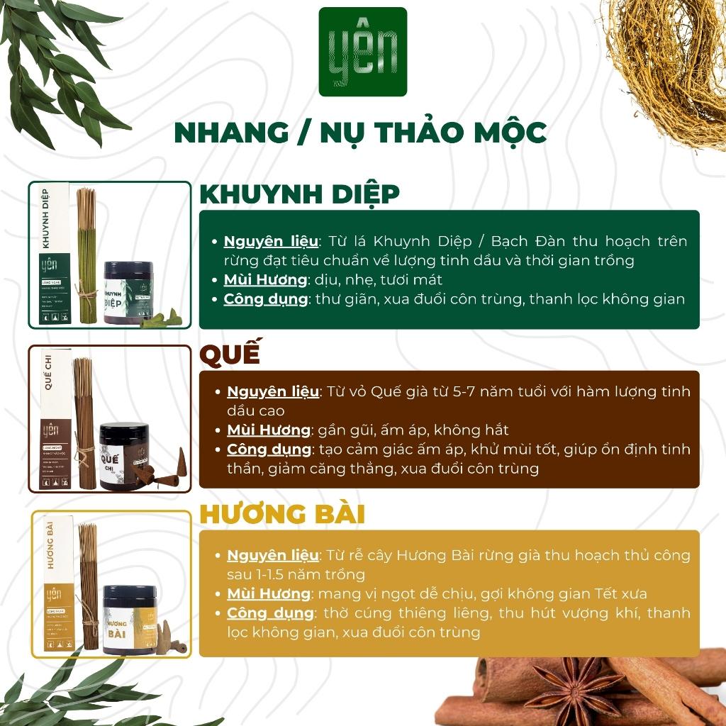 Thông tin sản phẩm Nhang Sạch Thảo Mộc Tự Nhiên YÊN Mix Quế Chi, Khuynh Diệp và Hương BàiXuất xứ nhang trầm hương: làng nghề Tùng Lộc, huyện Can Lộc, tỉnh Hà Tĩnh.Nhang quế chi: 98% làm từ vỏ quế g...