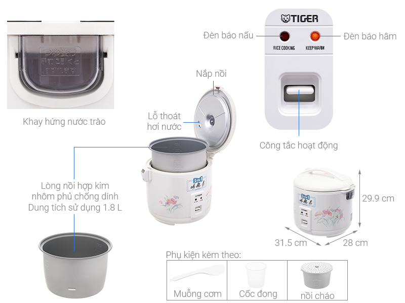 của thương hiệu Tiger - Nhật bản, với thiết kế trang nhã, khả năng nấu cơm nhanh chóng, dung tích 1.8 lít đáp ứng được khẩu phần cho 4 - 6 người, sẽ giúp bạn phục vụ những bữa cơm nóng hổi thơm ngon cho cả gia đình.