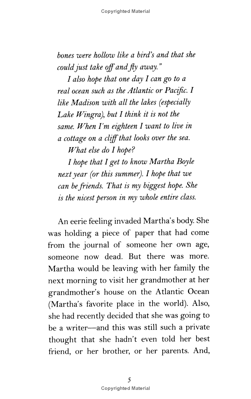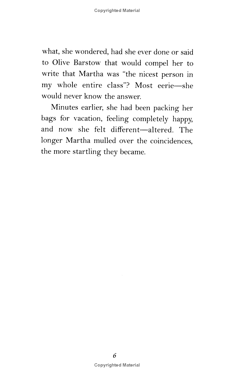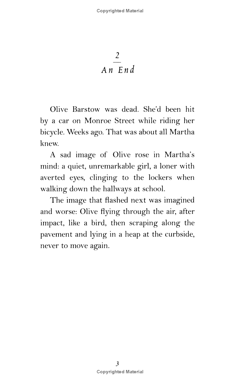 Sometimes life can change in an instant Martha Boyle and Olive Barstow could have been friends, but they weren't. Weeks after a tragic accident, all that is left are eerie connections between the two girls, former classmates who both kept the same secret without knowing it. Now, even while on vacation at the ocean, Martha can't stop thinking about Olive. Things only get more complicated when Martha begins to like Jimmy Manning, a neighbor boy she used to despise. What is going on? Can life for Martha be the same ever again?