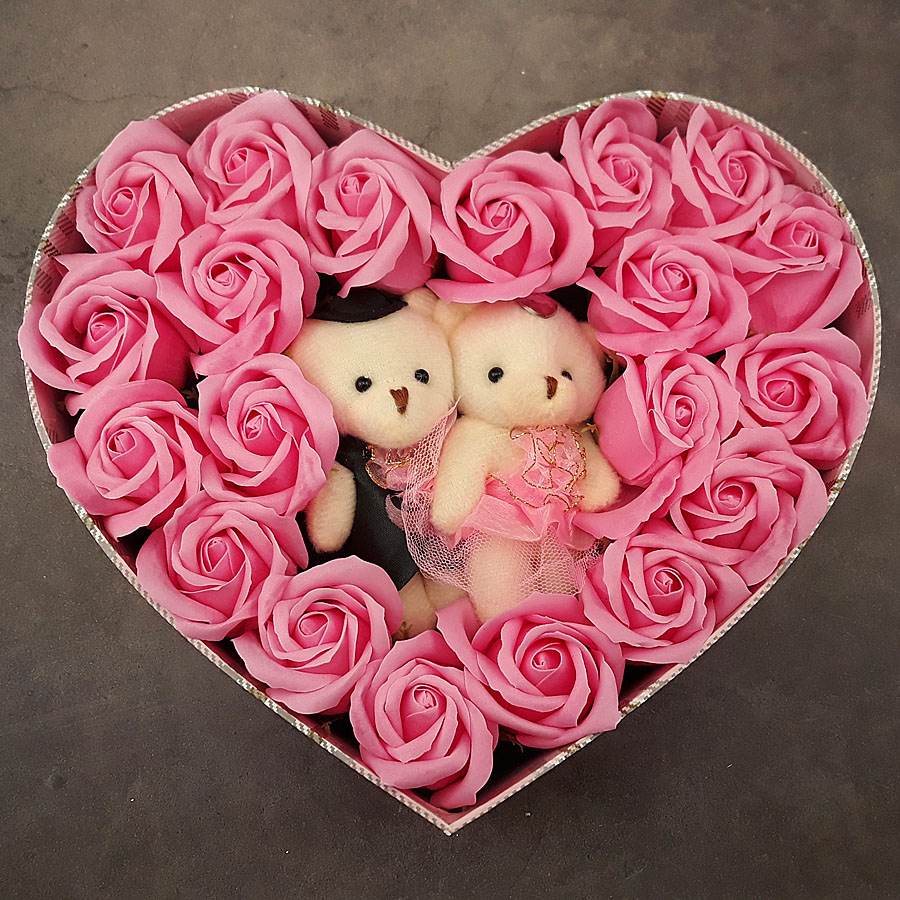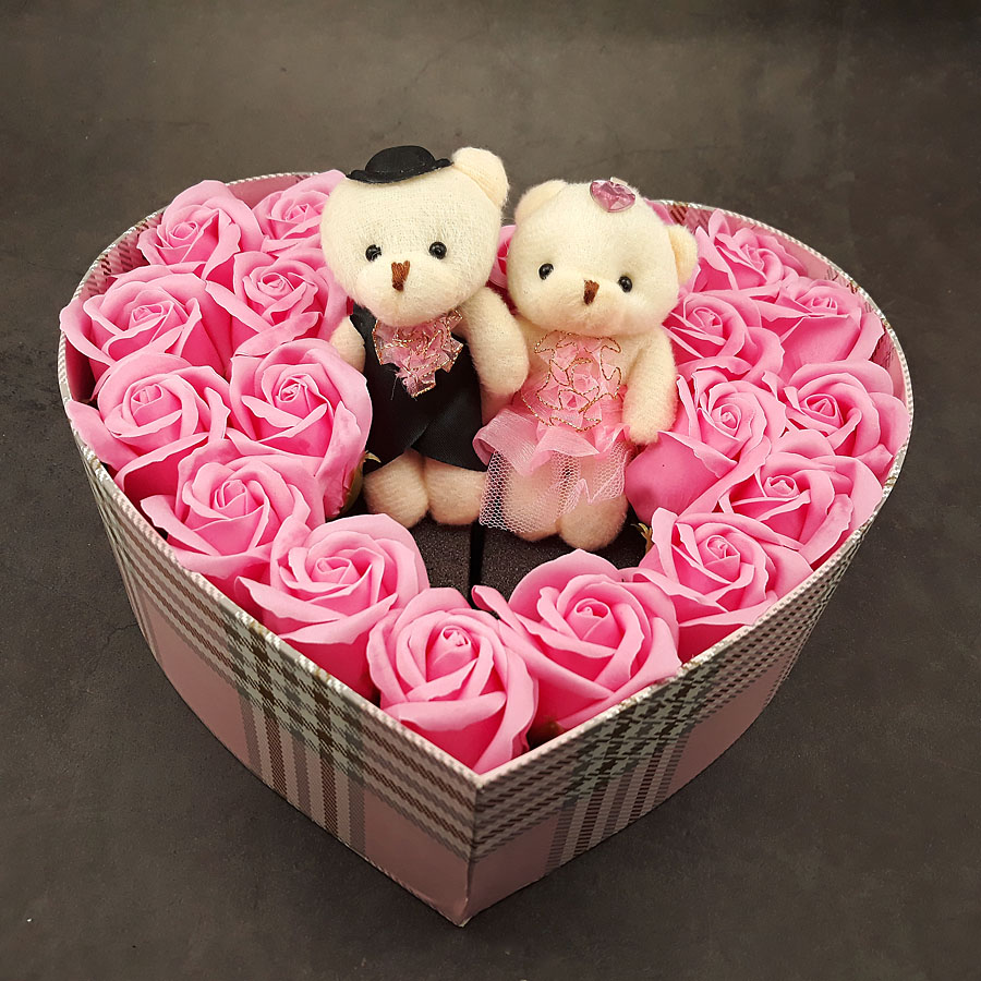 ✨Quà tặng sinh nhật, 8/3 cho bạn gái, vợ - hoa hồng sáp hộp tim 2 gấu, màu hồng - H15H
