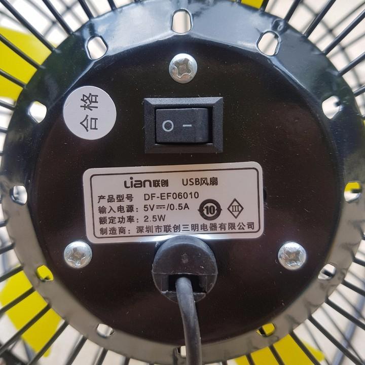 Quạt bàn có mầu đen cánh vàng và Bạn cũng có thể dùng với cục pin dự phòng của Bạn nếu cần.
