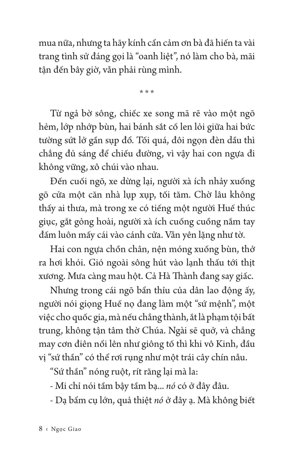 Có thể thấy nhà văn Ngọc Giao dành muôn vàn tình yêu thương cho Hà Nội, nơi ông đã gắn bó gần như suốt một đời dâu bể. Dáng hình Hà Nội xưa như còn đây, qua những trang văn đầy day dứt. Ấy là những phận đời phụ nữ long đong tựa cánh bèo trôi, kiếp lận đận của một công chức quèn, hay một mối tình ngang trái đã đi vào dĩ vãng. Ngọc Giao viết về họ, để thay người trút tiếng than thân, cũng để nguyện cầu một tia sáng soi đường. Đằng sau những phận người lao khổ, vẫn có niềm hy vọng vươn lên tìm đến ngày mai. Đằng sau những mỉa mai trước thói đời đen bạc, vẫn có niềm tin vào một tương lai con người vùng lên phản kháng mọi hoang đường dối trá, để được trở về với bản chất thủy chung, hồn hậu xưa nay.