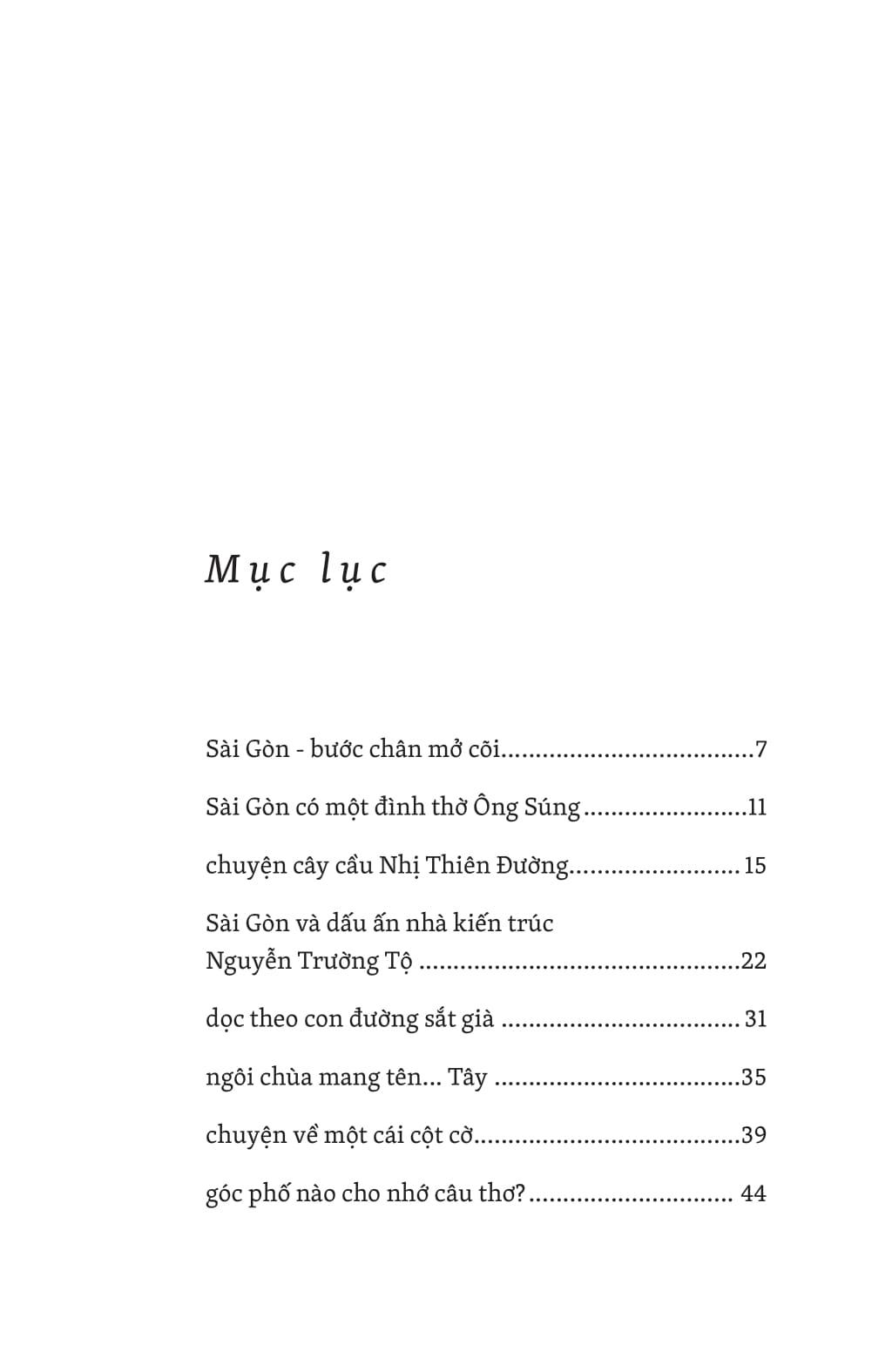 Trải qua hơn ba trăm năm biến thiên lịch sử vật đổi sao dời, vạn bước chân người đi qua đường ngang ngõ dọc, Sài Gòn dần thay màu áo mới, nhiều nơi chốn đã thay tên đổi họ, trở thành hoài niệm với hai chữ “Hồi đó…” vấn vương trong ký ức người cũ. Thước phim thời gian đưa độc giả lần về quá khứ, về với kiến trúc và tàn tích, phố xá và hàng me, rạp hát và cải lương, áo dài và sân trường, sách vở và báo chí… Bước chân đi qua ký ức lại về đến Thành phố Hồ Chí Minh hôm nay, với những con đường lưu đầy dấu xưa chuyện cũ. Hãy lần giở từng trang sách, để bước vào chuyến hành trình ghé thăm những thắng cảnh lịch sử đánh dấu cột mốc hào hùng, lắng nghe âm vang lịch sử còn nhắc lại, hít hà hương thơm cà phê và bát phở sáng của người Sài Gòn, xao xuyến trước tà áo dài xưa mềm mại yêu kiều, đắm chìm trong làn điệu cải lương ngọt ngào da diết... Chuyến hành trình đó mang tên “Sài Gòn - Đi qua ký ức”.