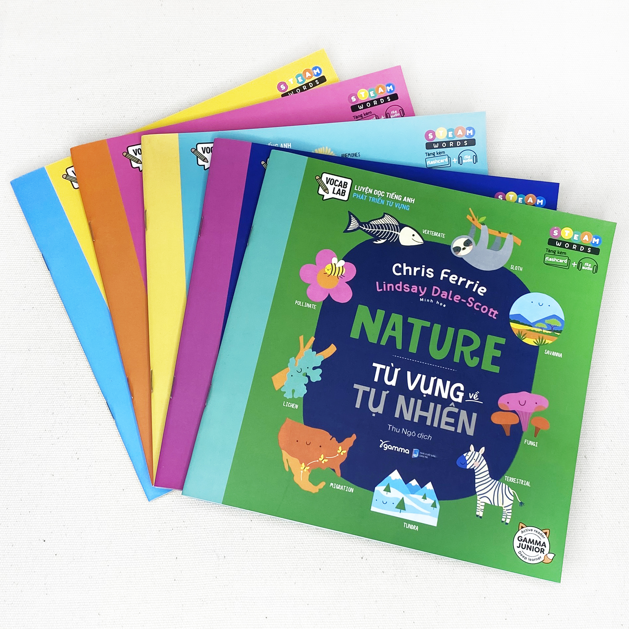 STEAM hiện là phương pháp giáo dục được ưa chuộng trên thế giới. Đây là phương pháp giảng dạy tích hợp nhằm trang bị cho học sinh đầy đủ kiến thức và kỹ năng liên quan đến 5 lĩnh vực: Science (Khoa học), Technology (Công nghệ), Engineering (Kỹ thuật), Art (Nghệ thuật), Mathematics (Toán học). Việc kết hợp các kiến thức từ nhiều môn học khác nhau sẽ giúp trẻ rèn luyện và phát triển nhiều kỹ năng thiết yếu cả trong học tập và cuộc sống. STEAM WORDS là bộ sách cung cấp những từ vựng tiếng Anh cần thiết về các lĩnh vực trên. Bộ sách gồm 10 cuốn, sẽ lần lượt được ra mắt trong năm 2022 này. 5 cuốn sách đầu tiên bao gồm: