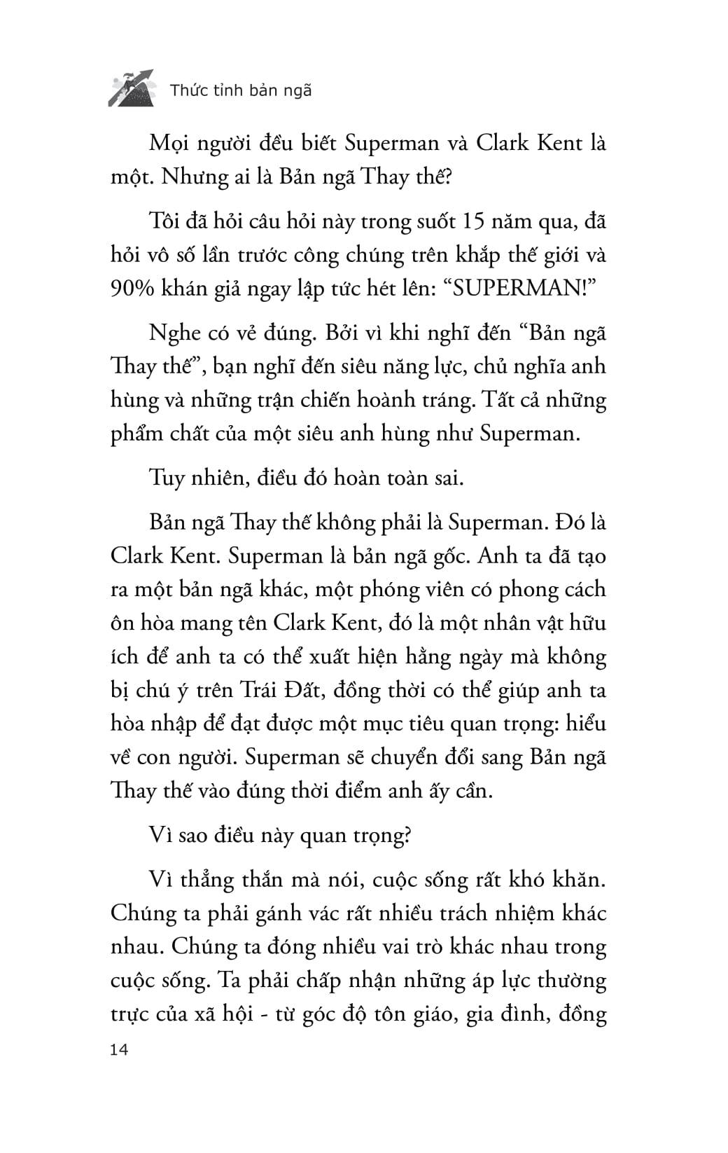 The Alter Ego Effect - Thức Tỉnh Bản Ngã Trong mỗi người đều tồn tại 2 bản ngã: một là “tôi” thường ngày với sự sợ hãi và do dự; và một “tôi” mạnh mẽ hơn, quyết đoán hơn, có khả năng tỏa sáng trong những khoảnh khắc quan trọng. Tuy nhiên, hầu hết chúng ta đều để bản ngã yếu thế kiểm soát. Trongcuốn sách “Thức tỉnh bản ngã”, tác giả Todd Herman - nhà huấn luyện hiệu suất đã đồng hành cùng hàng ngàn vận động viên, CEO và nghệ sĩ - tiết lộ một chiến lược tâm lý độc đáo: tạo ra alter ego (bản ngã thay thế). Đây là phương pháp tâm lý học đã được chứng minh hiệu quả, giúp chúng ta vượt qua sự nghi ngờ bản thân, những suy nghĩ tiêu cực và bất an đang kìm hãm năng lực, qua đó giúp mỗi cá nhân trở thành phiên bản tốt nhất của chính m.ình. Cuốn sách được tổng hợp dựa trên dữ liệu thu thập từ hơn 75.000 chủ doanh nghiệp và những chuyên gia trong các lĩnh vực đã áp dụng chiến lược alter go để chạm tới thành công. Không chỉ là một cuốn sách về tư duy tích cực “Thức tỉnh bản ngã” là một phương pháp thực chiến để bạn khai mở tiềm năng bị chôn giấu, đối diện với áp lực và tỏa sáng trong bất kỳ “sân chơi” nào của cuộc đời - từ công việc, thể thao đến nghệ thuật. Đọc xong cuốn sách này, bạn sẽ có thể: