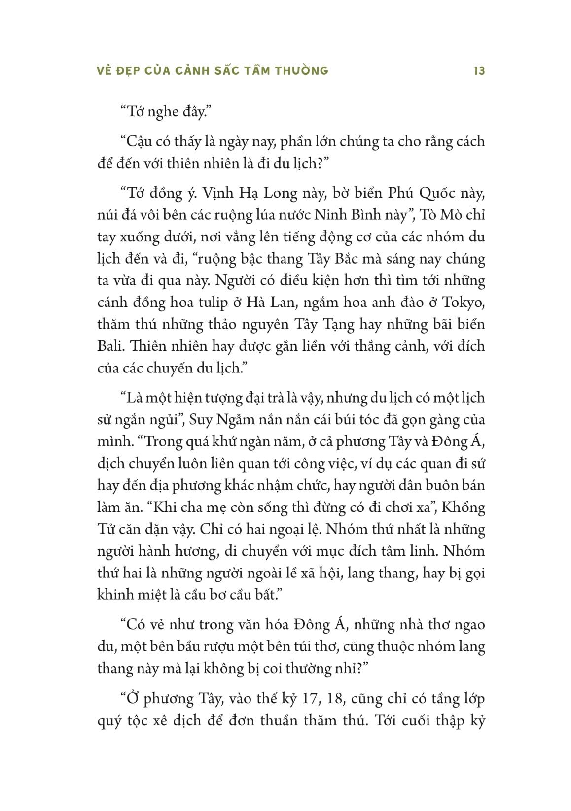 Đó là những gì đôi bạn tuổi trẻ: Tò Mò và Suy Ngẫm đã chia sẻ với nhau trong cuộc đối thoại độc đáo và lôi cuốn xuyên suốt hành trình mà cuốn sách Vẻ đẹp của cảnh sắc tầm thường của tác giả Đặng Hoàng Giang kể lại. Đó là hành trình theo không gian: từ rừng xuống biển, từ những cảnh quan trác tuyệt cho đến những cảnh sắc bình thường như đầm lầy, bãi cỏ, cánh đồng hoang, từ lúc đẹp trời đến cả lúc xấu trời, từ ngày mưa đến ngày nắng… Nhưng đó còn là hành trình theo chiều lịch đại, đi dọc lịch sử của những cách thức đến với thiên nhiên trong quá khứ, từ hàng nghìn năm trước đến nay, trong mối tương quan với quan điểm thẩm mĩ, bối cảnh xã hội và tư tưởng các thời đại khác nhau để lần ra gốc tích những quan niệm cái đẹp mà ngày nay người ta xem là hiển nhiên.