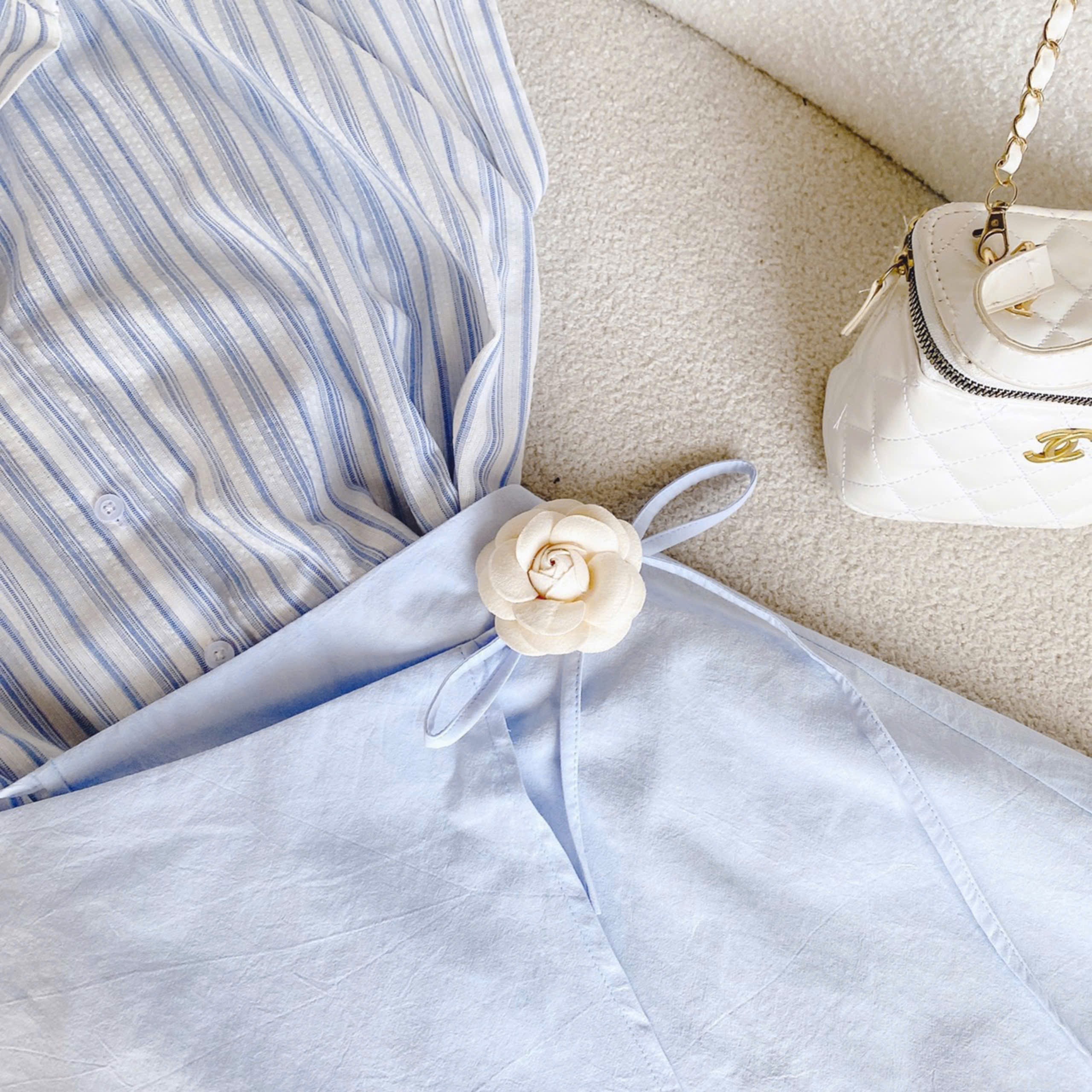 ✨Set đầm sơ mi kẻ sọc mix chân váy đắp tag hoa