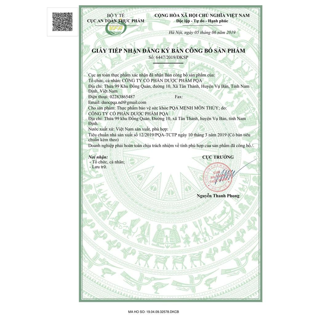 - Địa chỉ sản xuất: Công ty Cổ phần Dược phẩm PQA. Thửa 99, Khu Đồng Quàn, Xã Tân Thành, Huyện Vụ Bản, Tỉnh Nam Định. THÀNH PHẦN: