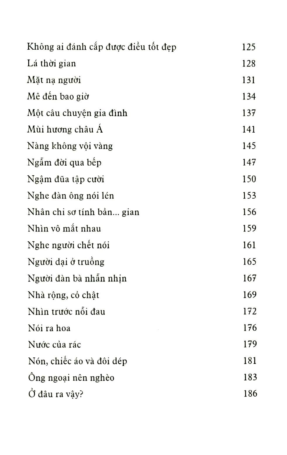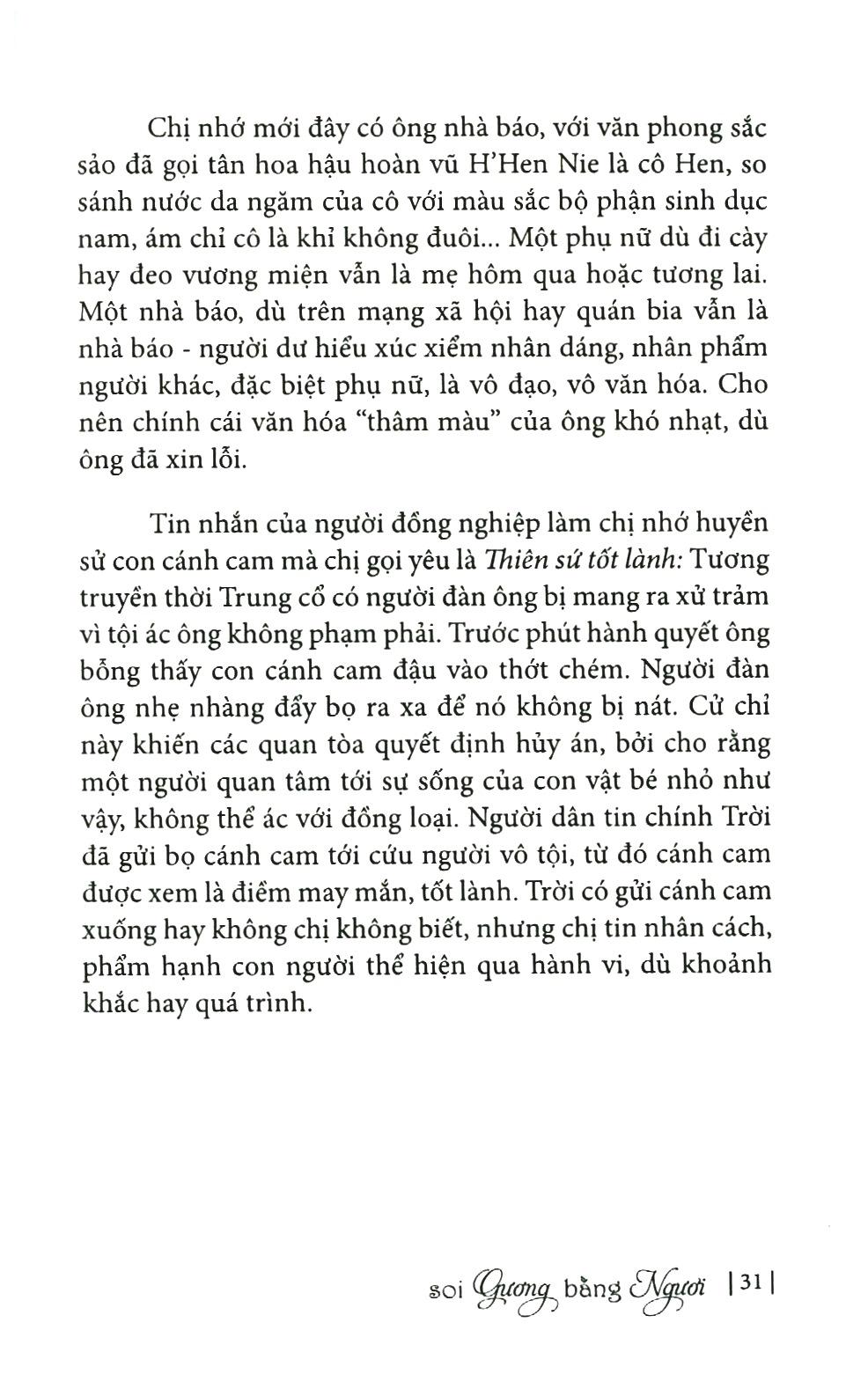 SOI GƯƠNG BẰNG NGƯỜI Bạn thân mến, Cuốn sách bạn cầm trên tay, lần này là tuyển hợp những bài viết đã đăng trên các báo, tạp chí Đẹp, Tuổi Trẻ, Thời báo kinh tế Sài Gòn, Phụ nữ, Thế giới tiếp thị từ cuối năm 2015 đến đầu năm 2019. Một vài tính thời sự trong đây có thể thay đổi nhưng ý nghĩa nhân văn, thế sự vẫn nguyên vẹn. Vẫn là cách xếp đặt ngẫu nhiên theo thứ tự chữ cái như các cuốn in trước, chỉ khác bên dưới mỗi bài viết lần này, tác giả không ghi tên báo, ngày tháng đã đăng; như một tiết chế tính thông tấn cho những câu chuyện, câu chữ, xét cho cùng chỉ để đeo mang chút nhân tì VIỆT LINH SOI GƯƠNG BẰNG CHỊ Tôi đọc bản thảo Soi gương bằng người của chị Việt Linh trong những ngày sương mùa xuân còn chưa tan ở Hà Nội. Tôi nghĩ rằng, bạn đọc chỉ cần đọc tên cuốn sách thôi, cũng có thể hình dung ra phần nào tinh thần của nó. Soi gương bằng người, nhìn người để soi mình, lặng yên nhìn cuộc đời để nhận ra những chân giá trị giản dị mà nhân văn nhất. Tôi rất thích cái tinh thần ấy. Có lẽ là, đến một thời điểm nhất định, sau những năm tháng quẫy đạp để trồi lên khỏi cái bề mặt cuộc sống, nhằm đạt tới những cái đích nào đó, nhằm ghi danh mình vào đâu đó, người ta sẽ muốn dừng lại. Dừng lại và điềm tĩnh nhìn cái cuộc sống đang diễn ra, đang trôi đi ngay bên cạnh mình. Nếu không dừng lại mà cứ lao đi với tốc độ không thể kìm hãm thì có lẽ cho đến tận lúc nhìn thấy cái chết, cũng không kịp nhận ra mình đã đi qua cuộc đời như thế nào, không thể nào phác họa nổi chân dung cuộc đời. Và khi đọc cuốn sách này, có lẽ, rất nhiều người sẽ muốn dừng lại để nhìn, để lắng nghe, để cảm nhận những gì đang lay động xung quanh. Nhưng để có thể điềm tĩnh như thế, có thể nhìn mọi điều diễn ra xung quanh bằng con mắt bao dung, độ lượng; nghĩ thong thả và sâu sắc, thì phải có không ít những năm tháng sống hết mình, thậm chí có lúc đày đọa mình trong khổ ải của lao động, của tư duy, thậm chí cũng phải đau đớn nhìn những mất mát. Tôi tin vậy.Chị Việt Linh, tôi thích gọi chị là chị Linh, một cách ấm áp, luôn có cách đặt vấn đề bất ngờ và thú vị. Một điều mà chị thường làm, là nghĩ ra tên bài viết trước khi viết. Tôi thấy khá là thú vị. Có những bài viết chị nghĩ ra cái tên từ ba năm trước khi thực sự viết vào nội dung. Tôi thường viết xong mới nghĩ cái tên, chị thì ngược lại. Nó cho thấy một lối tư duy chủ động. Tôi cứ nghĩ rằng lối tư duy ấy sẽ bó buộc cảm xúc của chị, nhưng hóa ra không phải. Chỉ trong vài trăm chữ, vẫn thấy nó phóng khoáng vô cùng. Nó có thể mở ra từ rất nhiều hướng. Nó đủ gây bất ngờ đối với người đọc. Tôi gọi đây là bản lĩnh tư duy. Bản lĩnh này khó có thể đến từ những người trẻ tuổi. Chị Linh, trong cuốn này, vẫn cái giọng điềm tĩnh, thư thả, có cảm giác như chị rủ rỉ tự nói cho mình nghe trước khi viết cho bạn đọc thấy - như là khi chị viết những bài trong cuốn 5 phút với ga xép, in cách đây chưa lâu. Tôi đặc biệt mê cái cách quan sát và chiêm nghiệm của chị. Bất kể chuyện gì, dù lặt vặt nhỏ bé đến đâu, qua sự quan sát của chị, đều mang tới một đúc kết, một triết lý vừa giản dị, vừa sâu sắc. Chị kể chuyện con gái thích ăn món thận, nhưng ở Pháp không có ai lọc phần hạch hôi bên trong giúp chị như các chợ ở Việt Nam, vì vậy, chị rất khó chịu khi phải làm việc đó. Và có lần chị nghĩ ra “Cứ lọc cắt phần thịt tốt xung quanh, cho tới khi đụng nang giữa thì ngưng lại, bỏ qua! Từ khi thực hiện phương pháp “bỏ qua” đó chị không ngán làm thận nữa, hơn vậy, còn nhận ra một suy ngẫm lý thú. Rằng nếu ta chỉ nâng niu những điều tốt đẹp, không để tâm cái xấu thì mọi thứ sẽ trở nên trôi chảy, nhẹ nhàng”. Vâng, bớt để tâm đến cái xấu thì mọi thứ sẽ trở nên trôi chảy, nhẹ nhàng. Lối tư duy này khiến cho mỗi ngày trôi qua của con người ta giữa cộng đồng, với đầy những nhếch nhác nhem nhuốc sẽ trở nên nhẹ nhõm bao nhiêu. Và nó như một quan điểm uyển chuyển nhưng bất biến trong mọi vấn đề mà chị gặp phải trong đời sống. Chị có nhiều năm sống ở nước ngoài, nhưng như chị viết, chị luôn nhớ Sài Gòn, luôn dành dụm tiền để liên tục trở về. Một Sài Gòn thân thương vô cùng trong cảm xúc của chị. Tôi thấy rõ sự yêu mến quê hương của chị. Quê hương còn nghèo khó, lạc hậu, thói hư tật xấu thì vô vàn trong cuộc sống thường nhật, nhưng cho dù là từ nước Pháp nhìn về hay khi đang ở quê nhà, cái nhìn của chị luôn thấm đẫm thương mến, tha thiết, độ lượng. Chấp nhận cả hay lẫn dở, như là một lẽ tất nhiên. Càng đi xa càng thấy mình bé nhỏ, đi xa để biết mình là ai, để ngẫm nghĩ về nơi đã sinh ra, dung dưỡng mình và luôn đón đợi mình quay về. Điều này