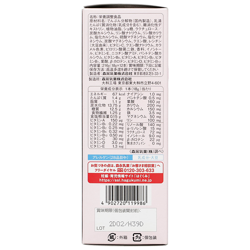 - Axit Folic hỗ trợ ngăn ngừa những dị tật bẩm sinh có nguy cơ ảnh hưởng đến sự phát triển của thai nhi. Hương vị thơm ngon Sữa bà bầu Morinaga vị trà sữa ngọt dịu, thanh mát, dễ uống. Sữa chứa lượng vừa đủ men có khả năng phân rã các thành phần khó tiêu giúp giảm bớt cảm giác khó tiêu, buồn nôn, ghê cổ, tiêu chảy… Thành phần cấu tạo Chất phân giải tinh bột (trong nước), chất tiêu hóa whey protein (bao gồm thành phần sữa), dextrin khó tiêu hoá, dầu thực vật, đường sucrose, đường lactulose/canxi cacbonat, natri phosphate, kali phosphate, muối canxi clorua, magie sulfat, muối magie clorua, magie cacbonat, axit citric, lecithin (nguồn gốc đậu nành), vitamin C, natri citrat, màu caramel, sắt pyrophosphate, hương liệu, inositol, vitamin E, nicotinamide, canxi pantothenate, vitamin B6, vitamin A, vitamin B2, vitamin B1, axit folic, beta-carotene, vitamin D, vitamin B12 Công dụng Sữa bầu Morinaga vị trà sữa cung cấp các loại vitamin và khoáng chất cùng các dưỡng chất quan trọng trong thời kỳ mang thai và cho con bú, đặc biệt không gây dị ứng và cũng rất thân thiện với dạ dày giúp bạn dễ hấp thu, tiêu hóa. Cách dùng: