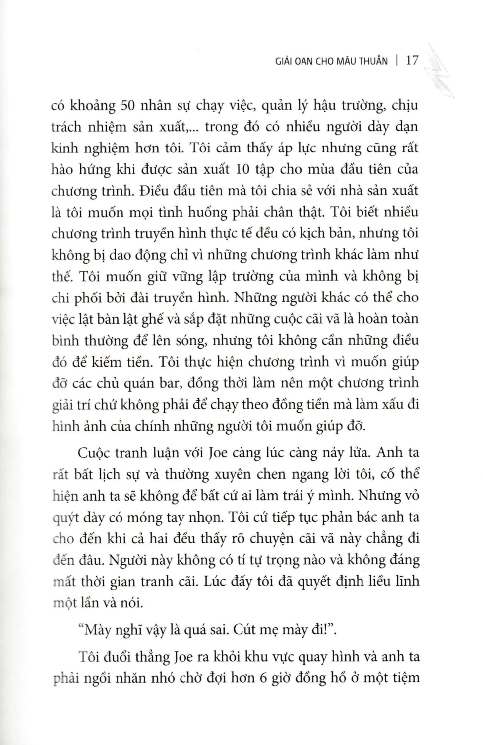 Dù bạn đang quản lý một doanh nghiệp hay chỉ muốn quản lý cuộc đời của chính mình, giữ gìn mối quan hệ tốt đẹp với gia đình, đồng nghiệp, bạn bè, thì bạn vẫn cần biết cách tận dụng mâu thuẫn. Không việc gì phải né tránh nó. Hãy đưa những vấn đề đang bị ẩn giấu ra ánh sáng và tạo ra những thay đổi tích cực. Hãy xả van căng thẳng và dồn năng lượng vào những việc có ích hơn.