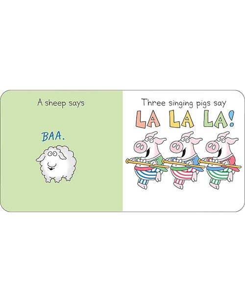 A cow says MOO. A sheep says BAA. Three singing pigs say LA LA LA!