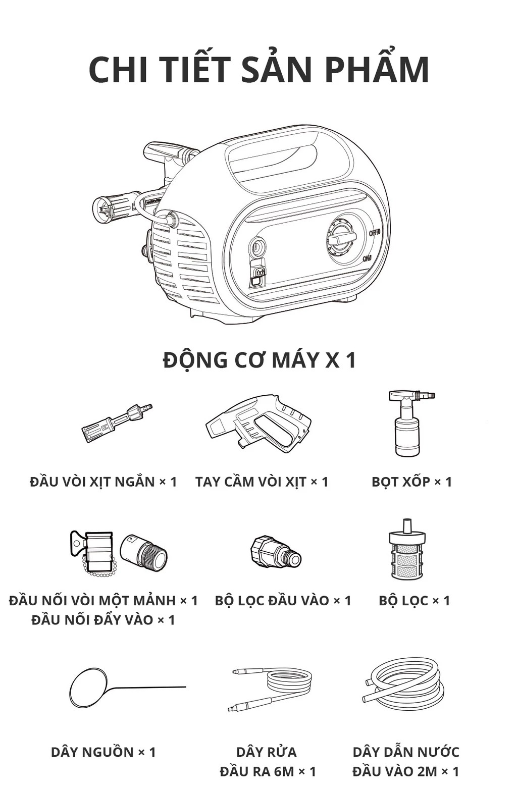 • Sản phẩm bao gồm: Máy rửa xe, Vòi xịt rửa, Bình bọt xốp, Các đầu nối dây, Bộ lọc nước, Dây nguồn, Dây rửa đầu ra 6m, Dây dẫn nước đầu vào 2m