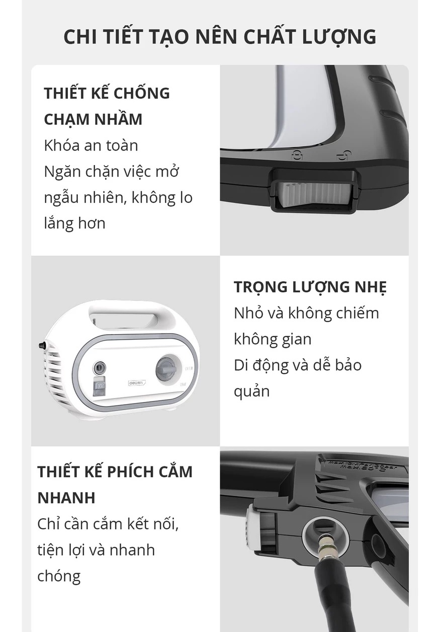 CÔNG DỤNG: +Xịt rửa xe máy, xe ô tô + Rửa sân vườn, chuồng trại, nhà cử + Tưới cây cảnh, các loại hoa, quả + Xịt rửa các vật dụng: thảm, điều hòa, Cửa