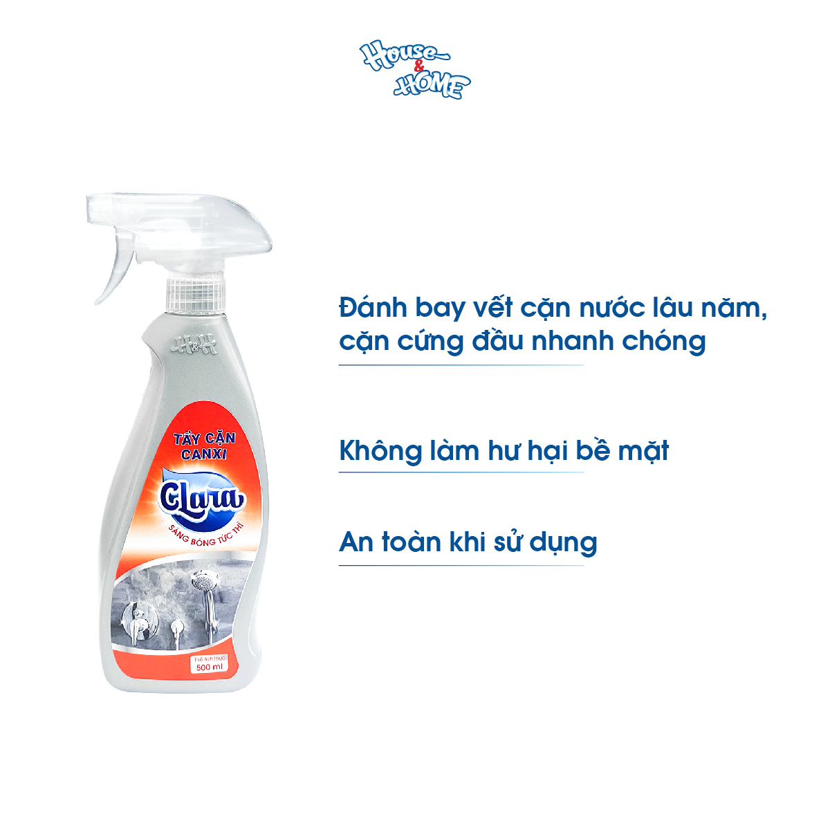 - Nước tẩy cặn canxi Clara đánh bay mọi vết gỉ sắt, cặn canxi, cặn bám lâu ngày trên vòi sen inox, vách kính, gương nhà tắm, lavabo và các loại thiết bị inox khác