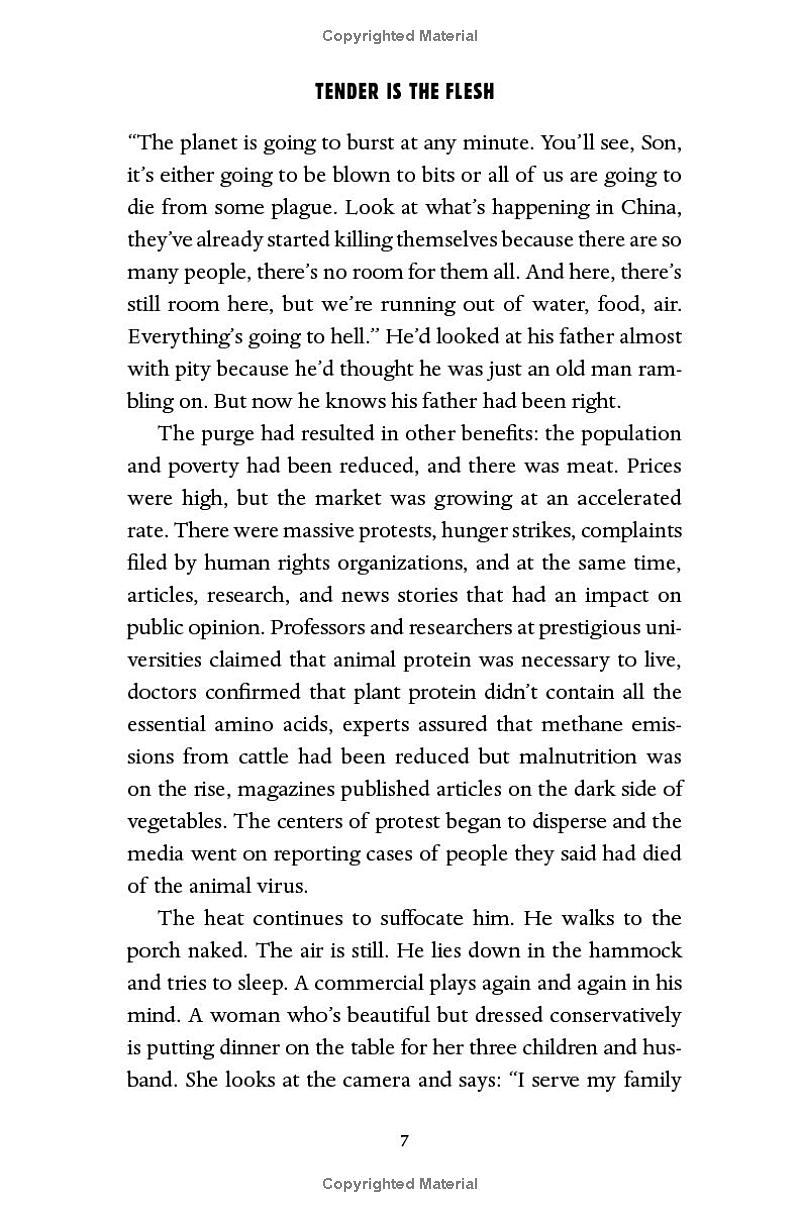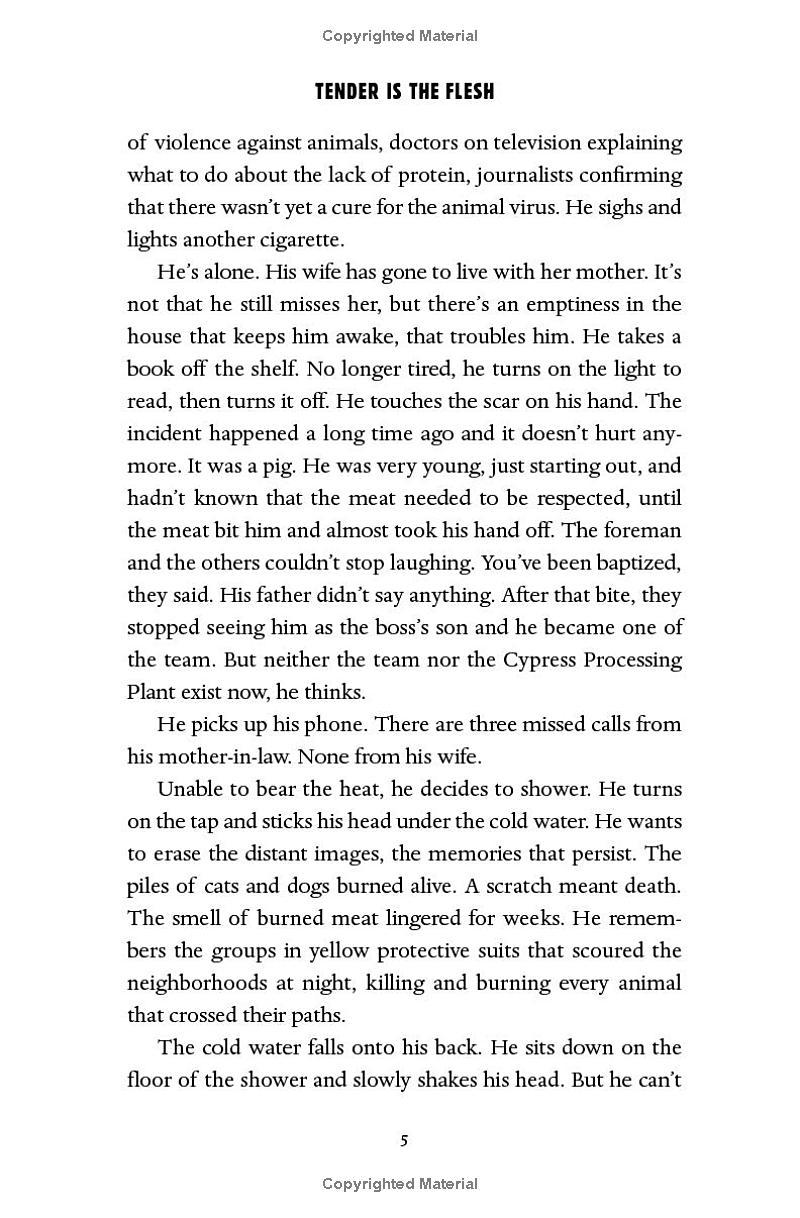 His wife has left him, his father is sinking into dementia, and Marcos tries not to think too hard about how he makes a living. After all, it happened so quickly. First, it was reported that an infectious virus has made all animal meat poisonous to humans. Then governments initiated the “Transition.” Now, eating human meat—“special meat”—is legal. Marcos tries to stick to numbers, consignments, processing.