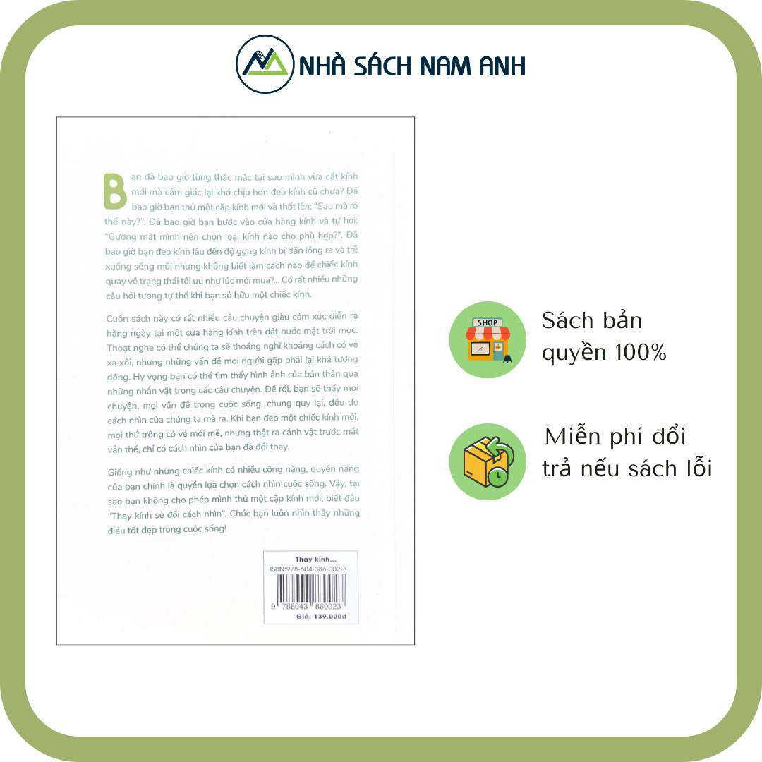- Có phải bạn đã làm sai gì không? Hãy cùng đến với những câu chuyện thực tế trên đất nước Nhật Bản của một cô gái làm nghề sửa kính, để bạn có thể tìm thấy hình ảnh của bản thân trong những câu chuyện bình dị ấy. *Cuốn sách gồm 20 câu chuyện, thông điệp và 4 bài tập thực hành giúp bạn thay đổi cặp kính thái độ. Để từ đó, bạn sẽ thấy mọi chuyện trong cuộc sống đều do cách nhìn của chúng ta mà ra. Khi bạn đeo một chiếc kính mới, mọi thứ trông có vẻ mới mẻ, nhưng thật ra cảnh vật trước mắt chẳng đổi thay, chỉ có cách nhìn của bạn đã đổi thay. Giống như những chiếc kính có nhiều công năng, quyền năng của bạn chính là quyền lựa chọn cách nhìn cuộc sống. Vậy tại sao bạn không cho phép mình thử một cặp kính mới cho tâm hồn, biết đâu khi “Thay kính, sẽ đổi cách nhìn” Chúc bạn luôn nhìn thấy những điều tốt đẹp trong cuộc sống! Một số review của các đọc giả