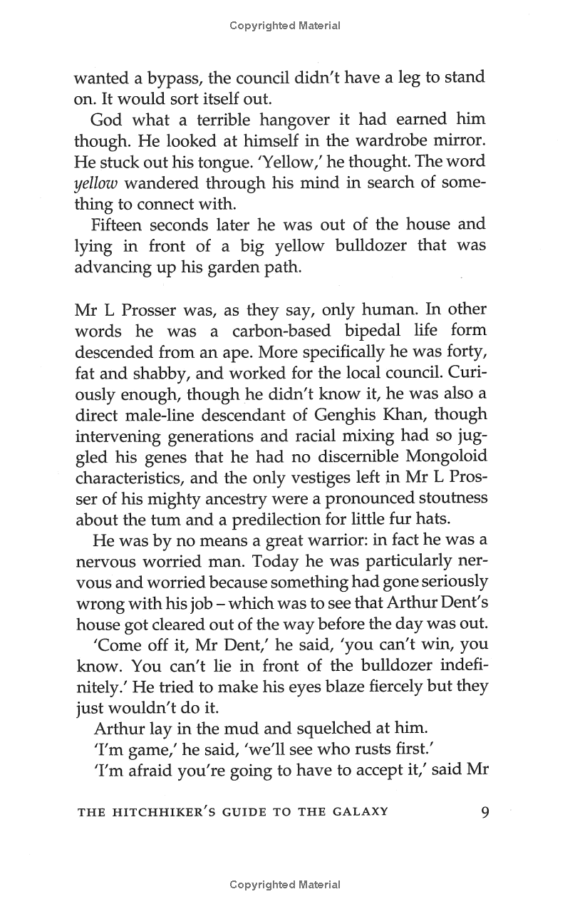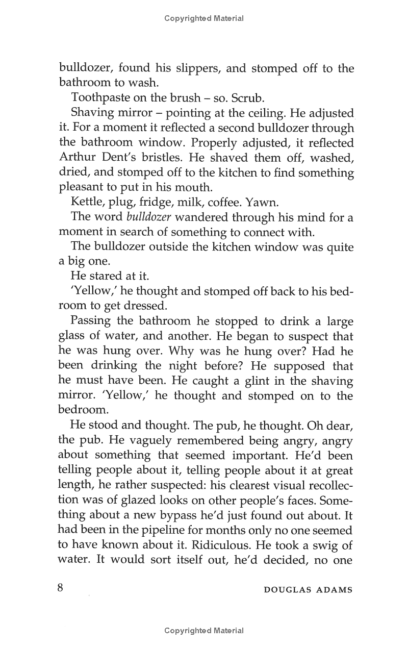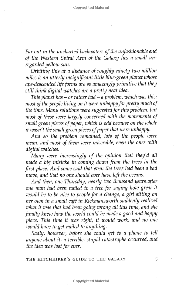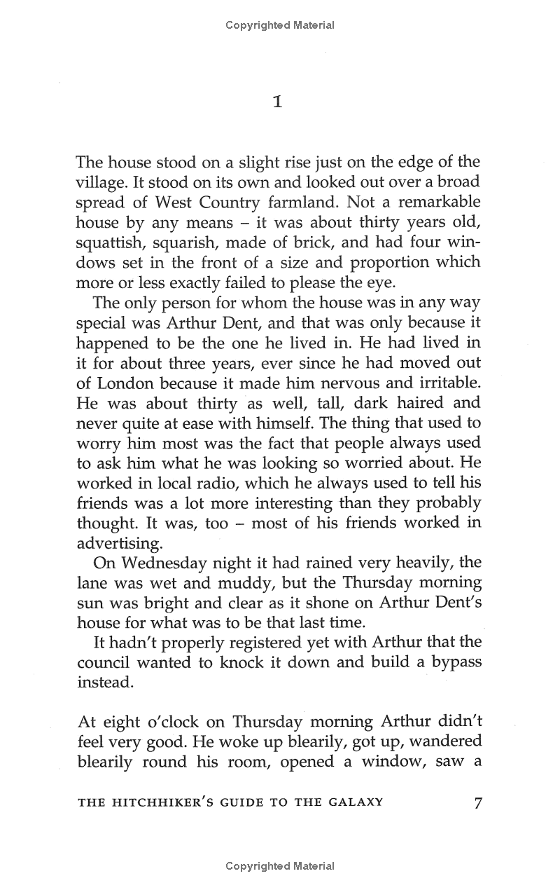 It's an ordinary Thursday lunchtime for Arthur Dent until his house gets demolished. The Earth follows shortly afterwards to make way for a new hyperspace express route, and his best friend has just announced that he's an alien. At this moment, they're hurtling through space with nothing but their towels and an innocuous-looking book inscribed, in large friendly letters, with the words: DON'T PANIC.