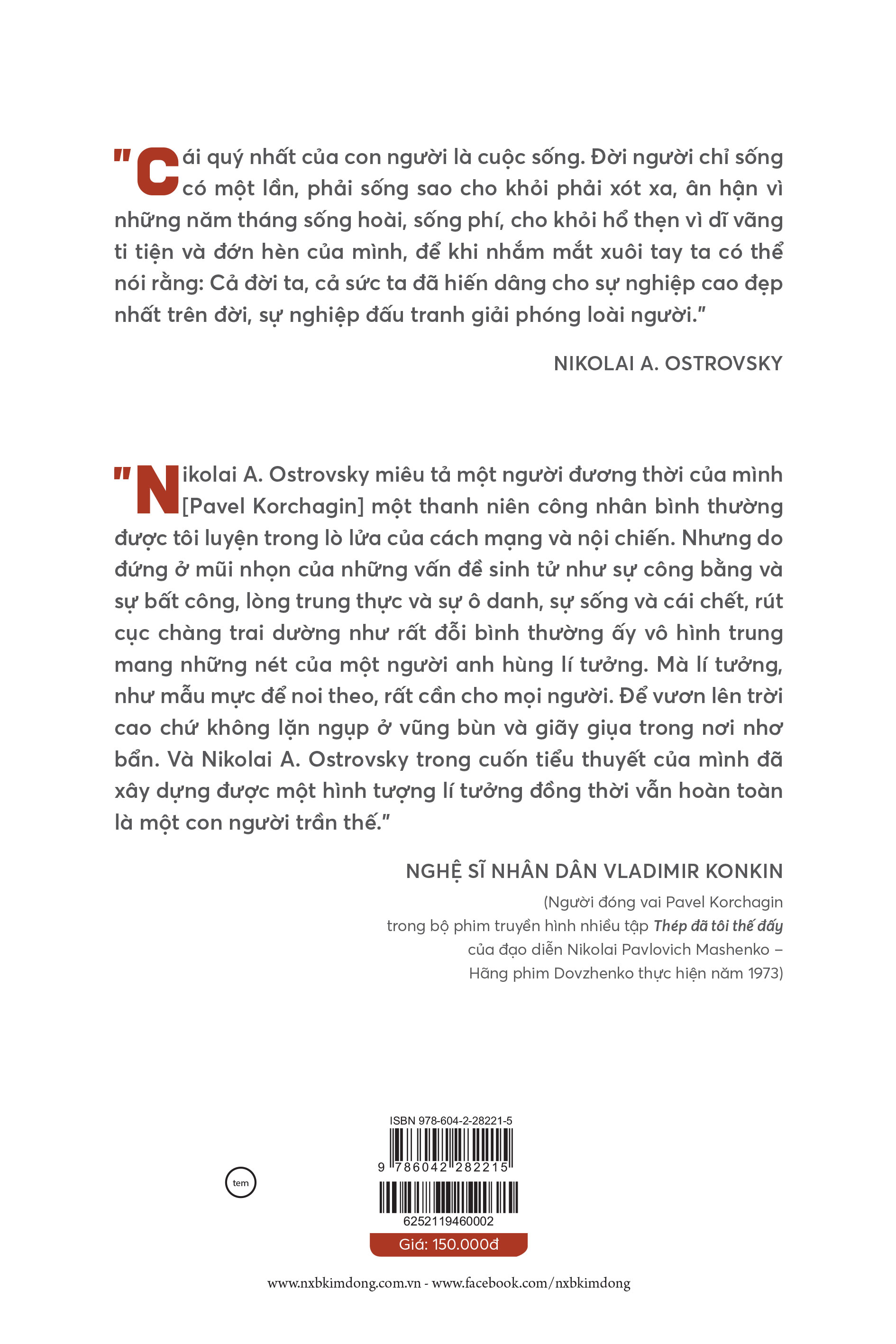 “Thép đã tôi thế đấy” là một trong những tác phẩm nổi tiếng nhất của văn học Nga Xô viết. Suốt hơn chín mươi năm kể từ lần xuất bản đầu tiên (1932) đến nay, dù trải qua nhiều biến cố, nhưng cuốn tiểu thuyết về người thanh niên Pavel Korsaghin với lí tưởng sống cao đẹp và ước mơ hiến dâng tuổi thanh xuân cho đất nước, quê hương vẫn được bạn đọc mến mộ, trân quý. Cuốn tiểu thuyết đặc biệt được viết bởi một con người đặc biệt, trong một hoàn cảnh đặc biệt. Tác giả của nó, nhà văn Nikolai Ostrovsky là thương binh, bị bệnh nặng, bị hỏng mắt và nằm liệt giường. Không chịu khuất phục số phận, ông đã miệt mài vẫn viết những dòng nhiệt huyết của trái tim tuổi trẻ cho đến hơi thở cuối cùng. “Cái quý nhất của con người là cuộc sống. Đời người chỉ sống có một lần, phải sống sao cho khỏi phải xót xa, ân hận vì những năm tháng sống hoài, sống phí, cho khỏi hổ thẹn vì dĩ vãng ti tiện và đớn hèn của mình, để khi nhắm mắt xuôi tay ta có thể nói rằng: Cả đời ta, cả sức ta đã hiến dâng cho sự nghiệp cao đẹp nhất trên đời, sự nghiệp đấu tranh giải phóng loài người.”
