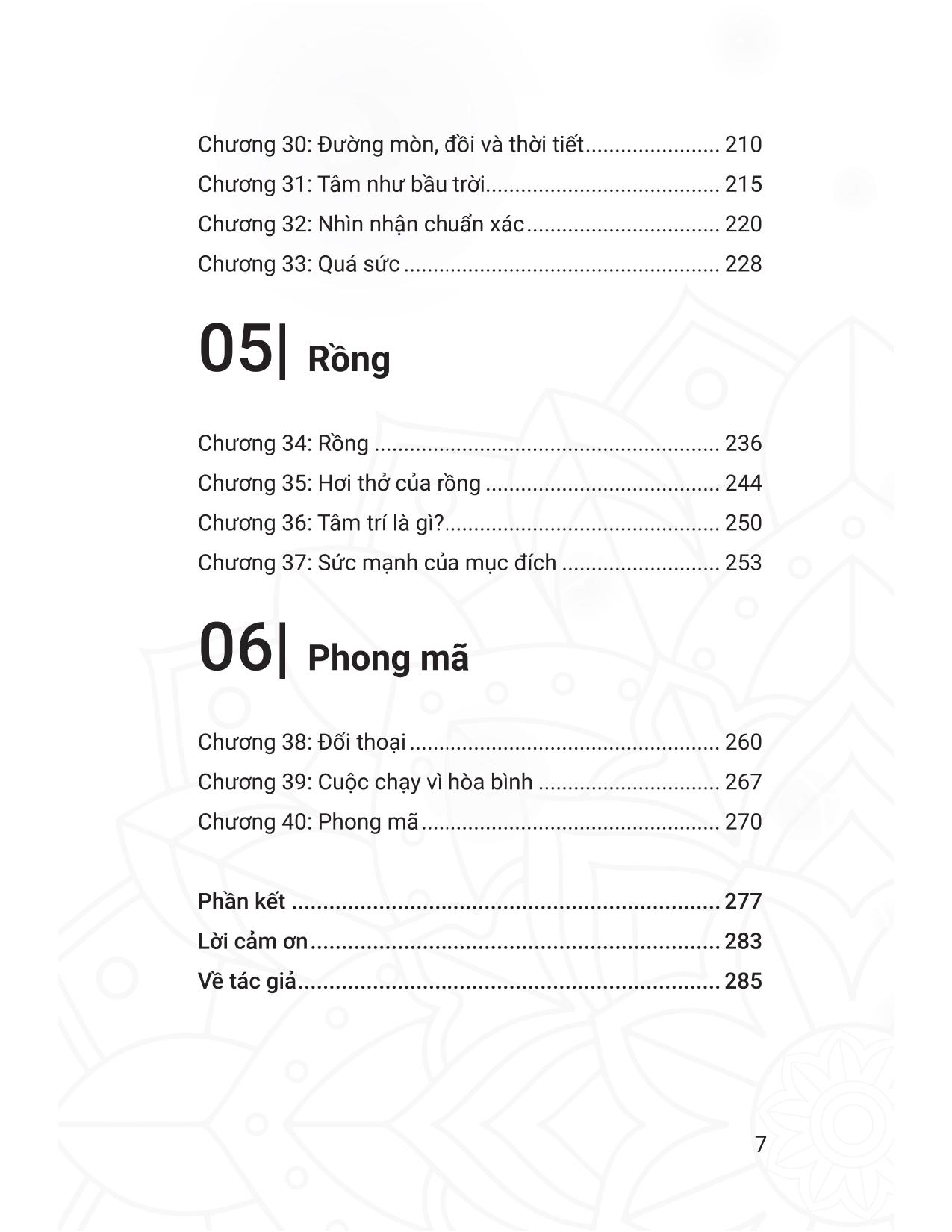 “Giống như khi chạy, thiền giúp ta bỏ lại những lo toan thường nhật - những mơ mộng, áp lực và toan tính. Ta sẽ tập trung vào hiện tại, đặt mình vào từng khoảnh khắc, từ đó giúp tâm trí trở nên mạnh mẽ hơn và hệ thần kinh bắt đầu được thư giãn. Ta biết quý trọng và ý thức được những gì mình có. Trí tuệ và khả năng ghi nhớ của ta cũng trở nên sắc bén hơn. Ta mở rộng được góc nhìn của mình về thế giới, không còn bị cầm tù trong những xúc cảm biến ảo thất thường. Tình yêu, lòng vị tha và những phẩm chất tích cực khác cũng ở gần tầm tay hơn. Và cũng như khi chạy, ta sẽ cảm thấy được thanh lọc sau khi thiền, vì một nguyên nhân tương tự: thiền là một hoạt động tự nhiên và lành mạnh cho tâm trí.”