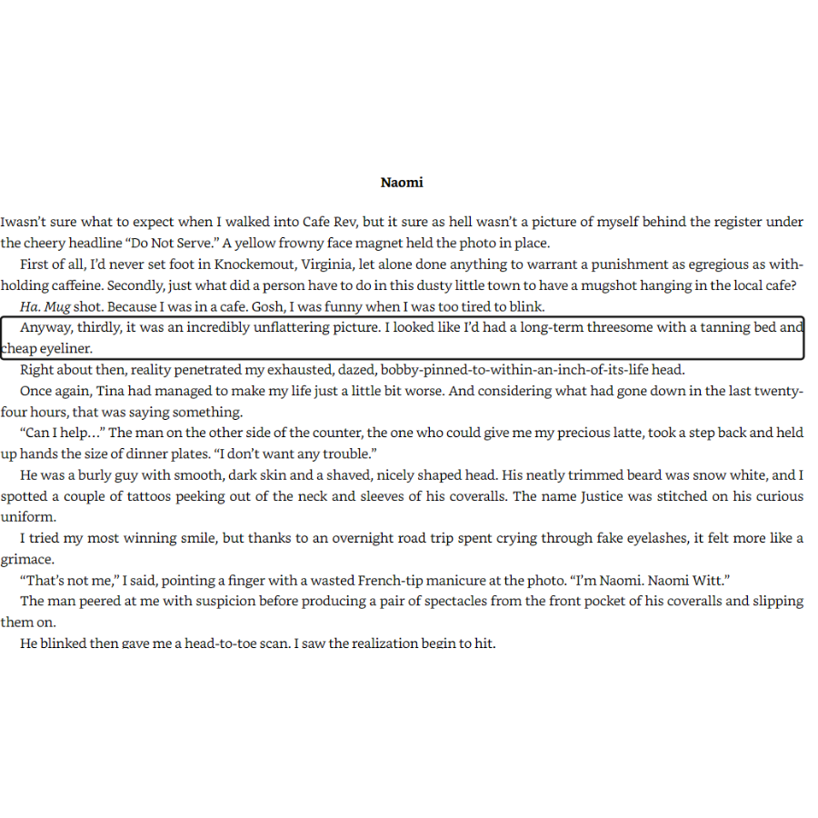 Naomi wasn’t just running away from her wedding. She was riding to the rescue of her estranged twin to Knockemout, Virginia, a rough-around-the-edges town where disputes are settled the old-fashioned way…with fists and beer. Usually in that order.