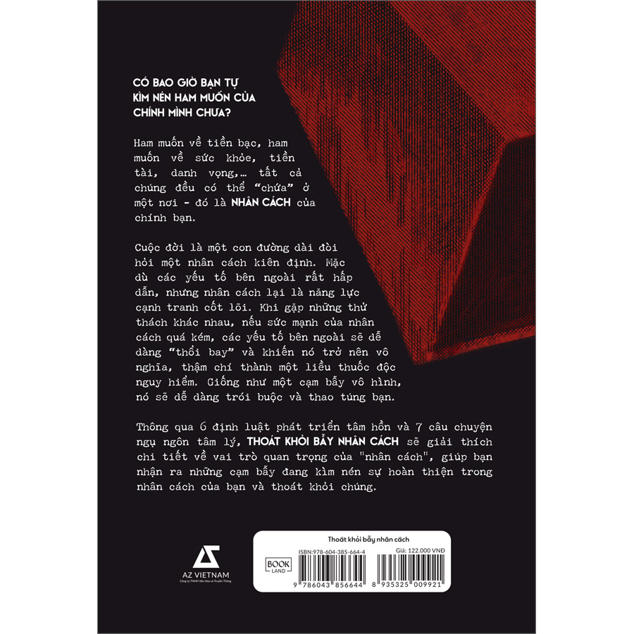 Có bao giờ bạn tự kìm nén HAM MUỐN của chính mình chưa? Phân tâm học cho rằng có một loại cơ chế tự vệ đặc biệt, được gọi là “sự kìm nén khả năng bản thân”. Con người luôn những ham muốn về tiền bạc, ham muốn về sức khỏe, tiền tài, danh vọng,… tất cả chúng đều hội tụ lại và có thể “chứa” ở một nơi – đó chính là NHÂN CÁCH. Nếu nơi đó bị quá tải, không thể giải phóng, chúng ta sẽ dễ dàng bị hạ gục và rơi vào cạm bẫy. Cuộc đời là một con đường dài đòi hỏi một nhân cách kiên định. Càng đi sâu về điểm này, mọi người sẽ càng sớm hiểu rằng mặc dù các yếu tố bên ngoài rất hấp dẫn, nhưng nhân cách lại là năng lực cạnh tranh cốt lõi. Khi gặp những thử thách khác nhau, nếu sức mạnh của nhân cách quá kém, các yếu tố bên ngoài sẽ dễ dàng “thổi bay” và khiến nó trở nên vô nghĩa, thậm chí thành một liều thuốc độc nguy hiểm. Giống như một cạm bẫy vô hình, nó sẽ dễ dàng trói buộc và thao túng bạn. Thông qua 6 định luật phát triển tâm hồn và 7 câu chuyện ngụ ngôn tâm lý, THOÁT KHỎI BẪY NH N CÁCH sẽ giải thích chi tiết về vai trò quan trọng của “nhân cách”, giúp bạn nhận ra những cạm bẫy đang kìm nén sự hoàn thiện trong nhân cách của bạn và thoát khỏi chúng. Mục lục: