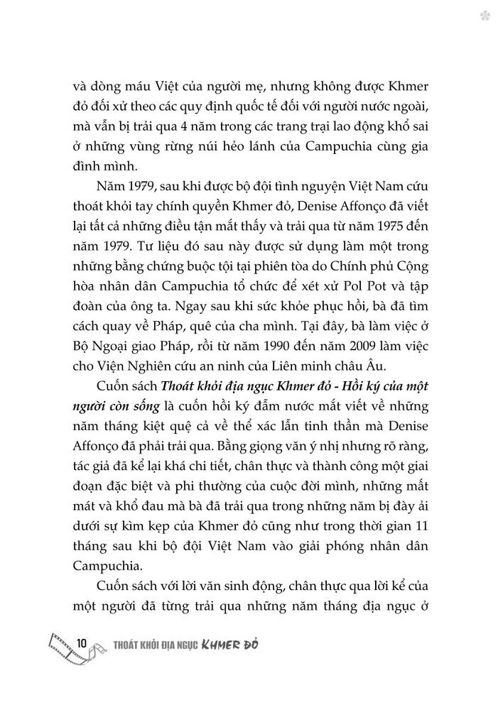 Mua tại TiktokCuốn sách Thoát khỏi địa ngục Khơmer đỏ - Hồi ký của một người còn sống là cuốn hồi ký đẫm nước mắt viết về những tháng năm kiệt quệ cả về thể xác lẫn tinh thần mà Denise Affonco đã phải trải qua.