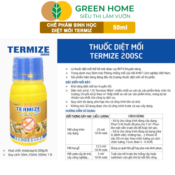 Thuốc diệt mối thế hệ mới Termize 200SC diệt cả đàn (50ml). Liều pha cực thấp siêu tiết kiệm. THÀNH PHẦN Imidacloprid … 200g/lít Phụ gia ……vừa đù 1 lít QUY CÁCH Chai 50ml HƯỚNG