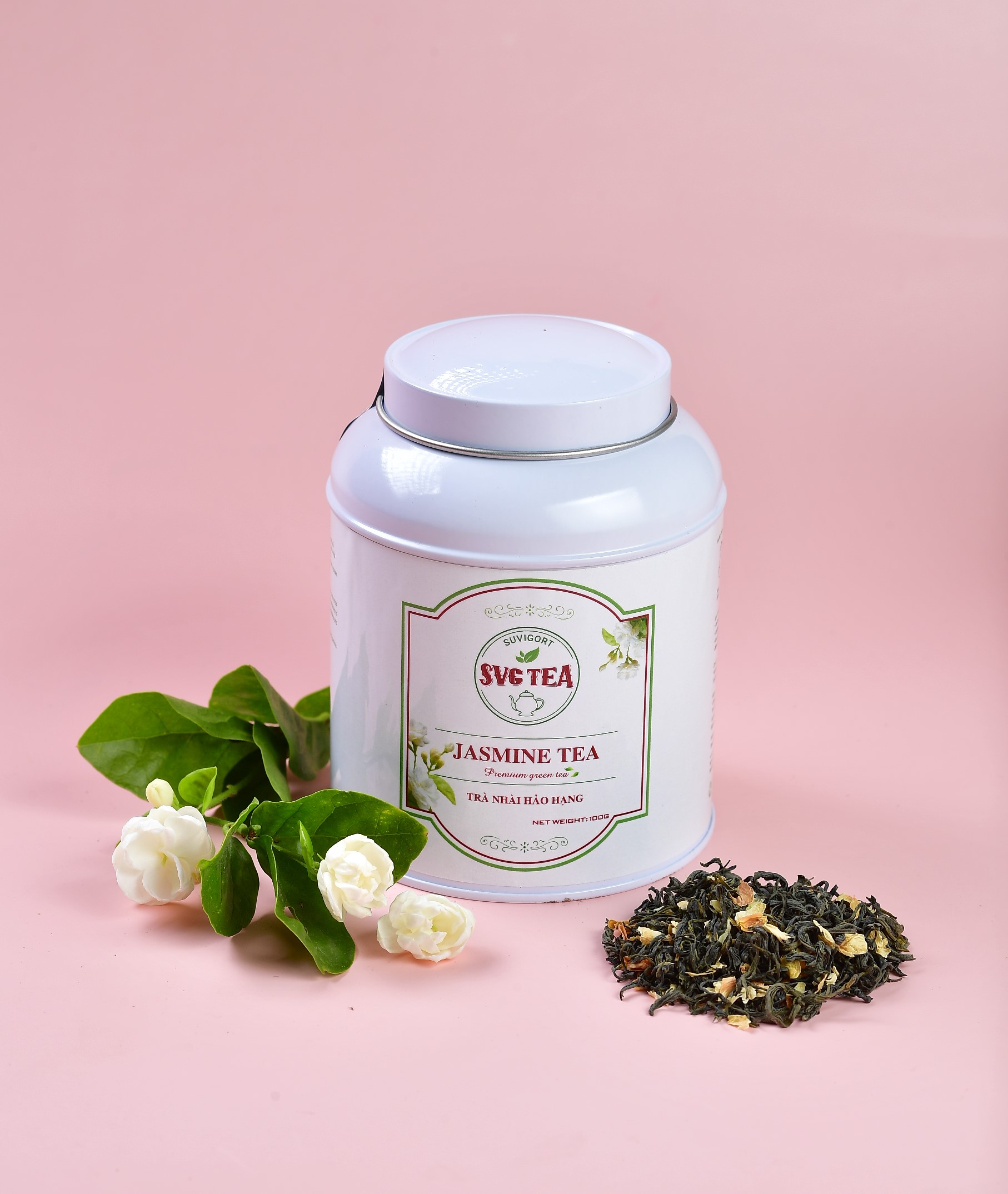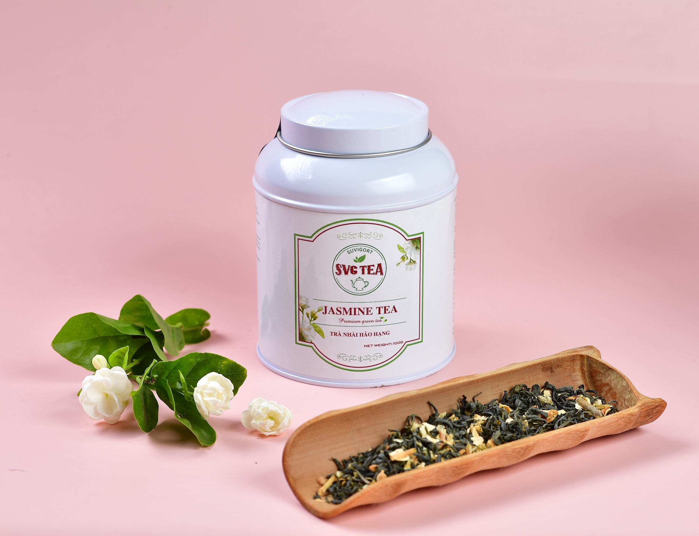 Trà Nhài hảo hạng SVG gồm những nõn trà xanh tươi nguyên được thu hái từ vùng chè Tân Cương nổi tiếng Thái Nguyên. Được chế biến, sao sấy theo tiêu chuẩn sạch, an toàn sau đó ướp hương bằng hoa nhài tươi thơm mát và tiếp tục phối trộn với những cánh hoa nhài khô thơm dịu dàng, tinh khiết tạo ra dòng trà xanh hoa nhài (trà nhài) đặc biệt thơm ngon và tao nhã.